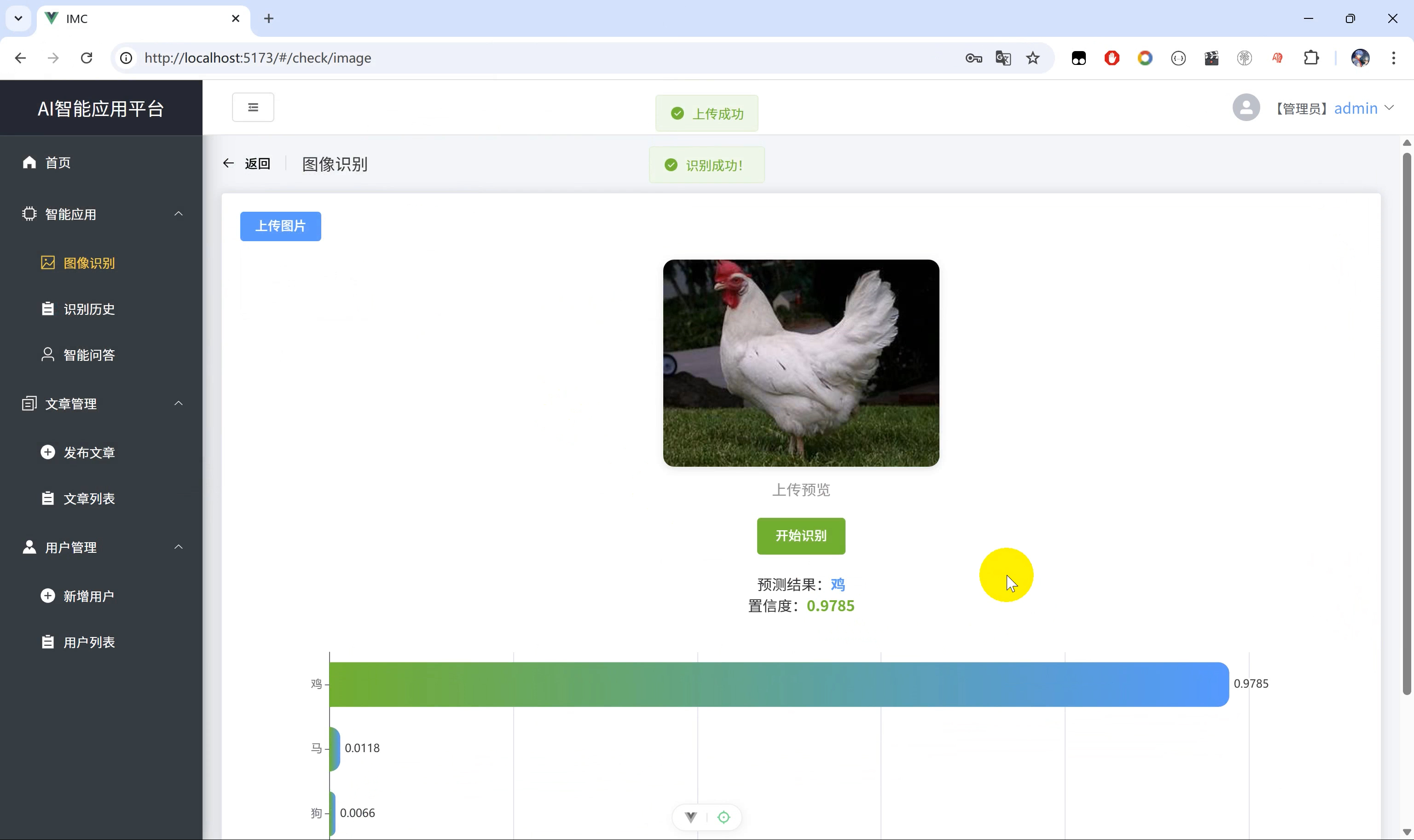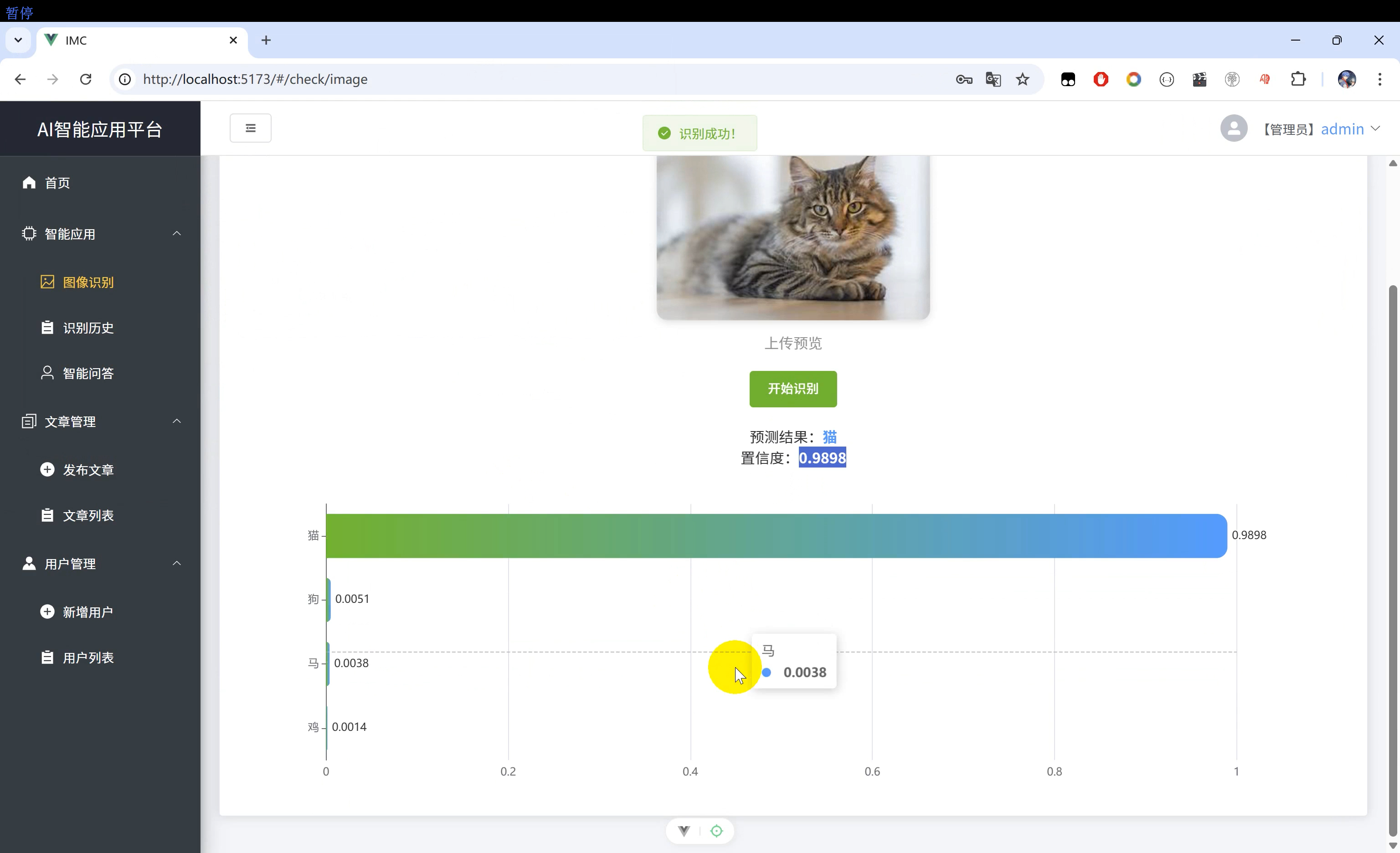 - 在图像识别功能中,用户上传图片后,点击识别,可输出其识别结果和置信度