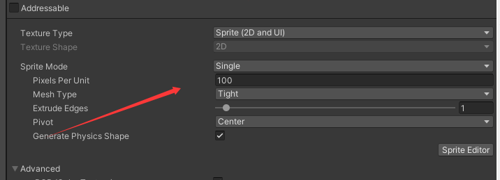 点击图片,找到pixels per unit 默认是100,这个是单位大小的图片像素数量,越大就越清晰,越小就越模糊