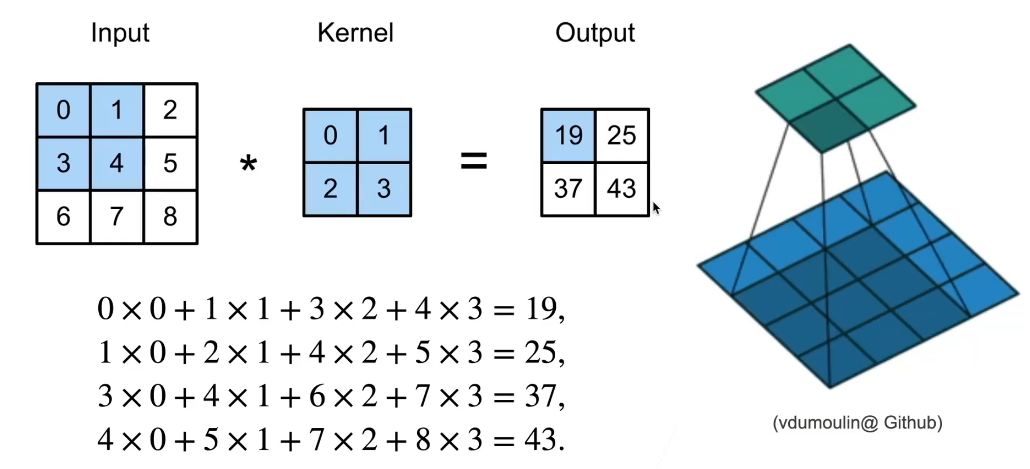0,对应输入区域的0或1→ 计算0 × 0、0 × 1(这些项的结果都是 0); - 卷积核的