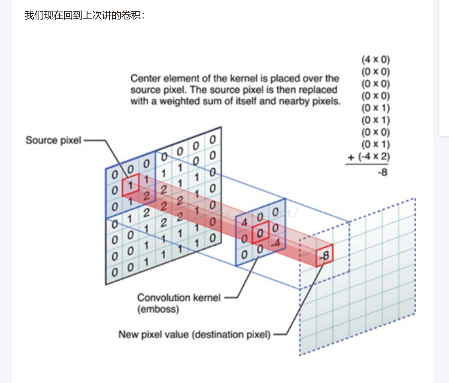 图中的计算总和为:4×0+(0×0)×n+(0×1)×m+(−4×2)=0+0+0−8=−8这个-8就是当前位置的输出像素值(图中红色框标注的 "New pixel value")。