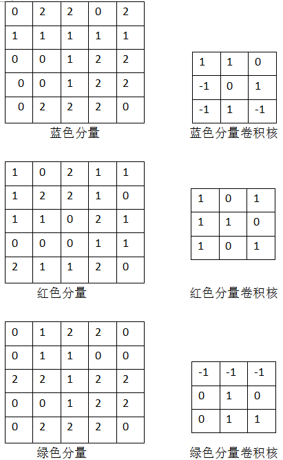 输入是 (Cin=3,Hin=5,Win=5) 的 RGB 图像,用 2 个 (Cin=3,k=3,k=3) 的锐化核: