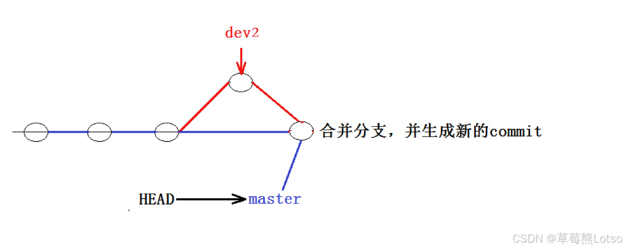 为了在 master 主分支上能看到新的提交,就需要将 dev 分支合并到 master 分支,合并分支的核心逻辑是 "将源分支的提交记录合并到目标分支",需先切换到目标分支,再执行合并命令。