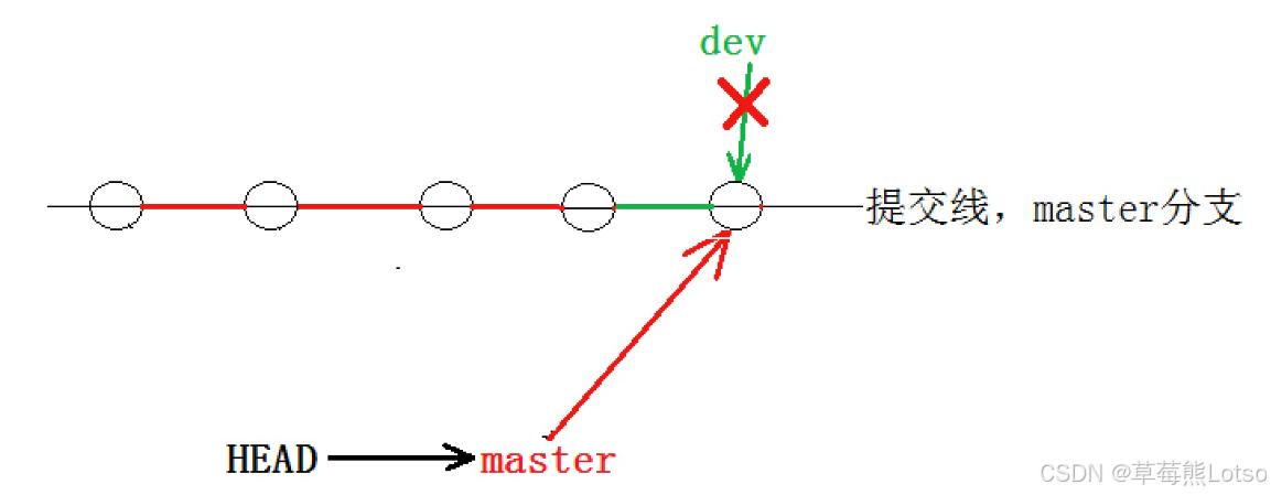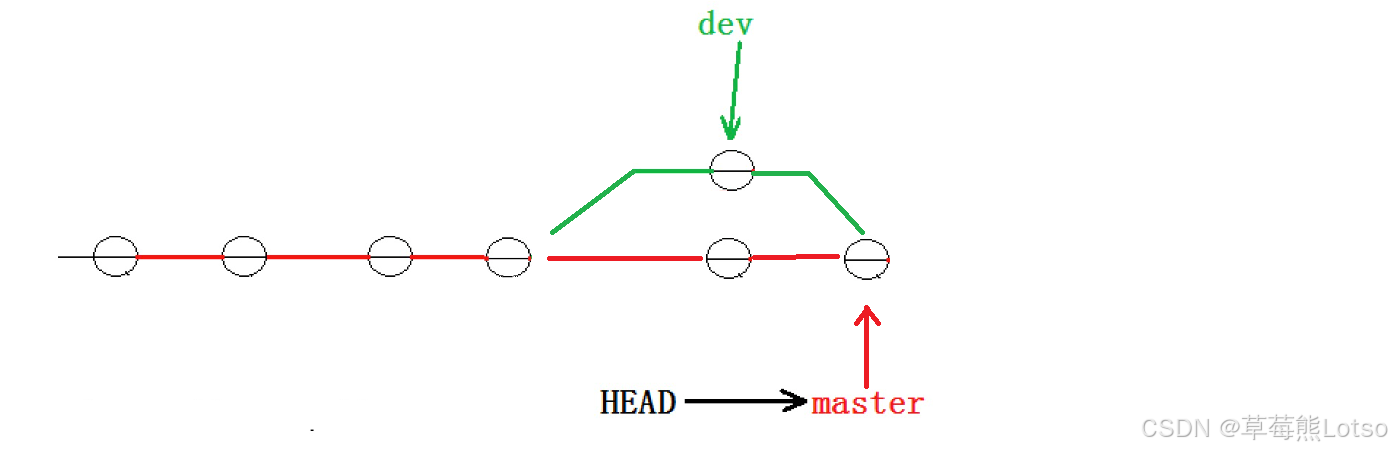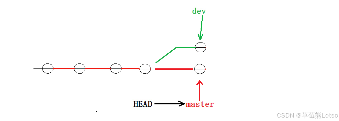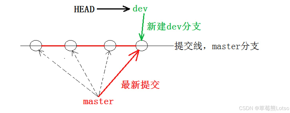 看到这里大家应该就都明白了,因为我们是在 dev 分支上提交的,而 master 分支此刻的提交点并没有变,此时的状态如下图所示: