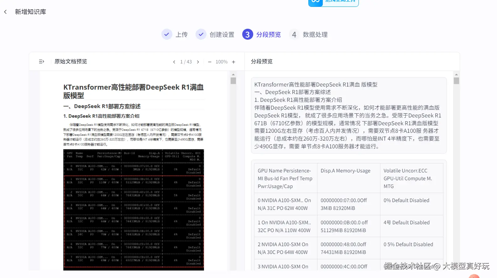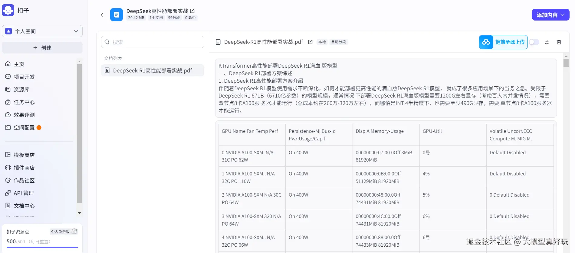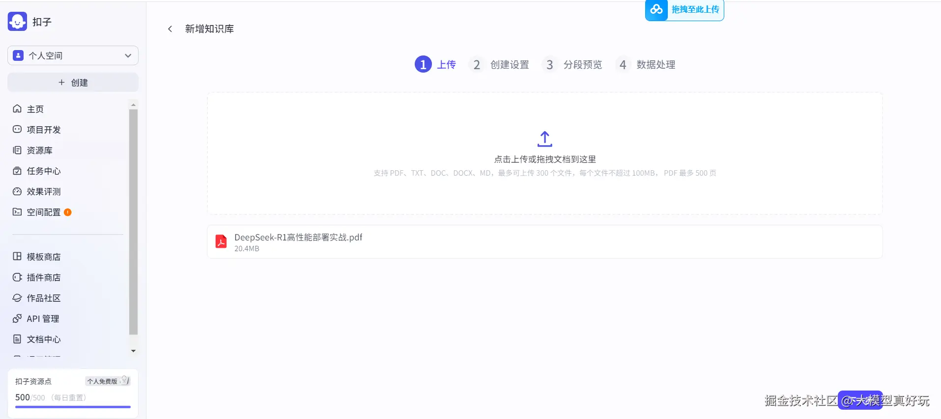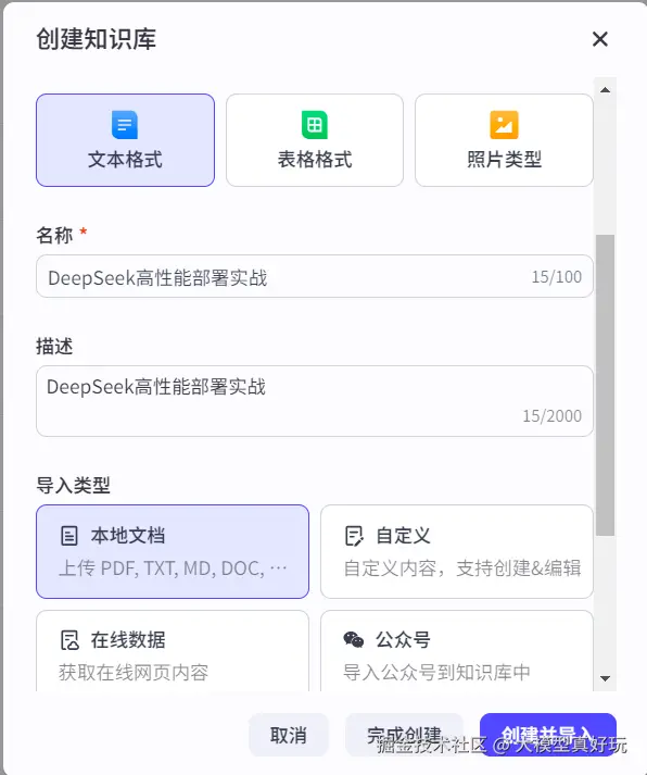 创建知识库并上传文件: 选择创建「扣子知识库」,本次演示将以文本格式上传笔者之前的笔记《DeepSeek高性能部署实战》文档。