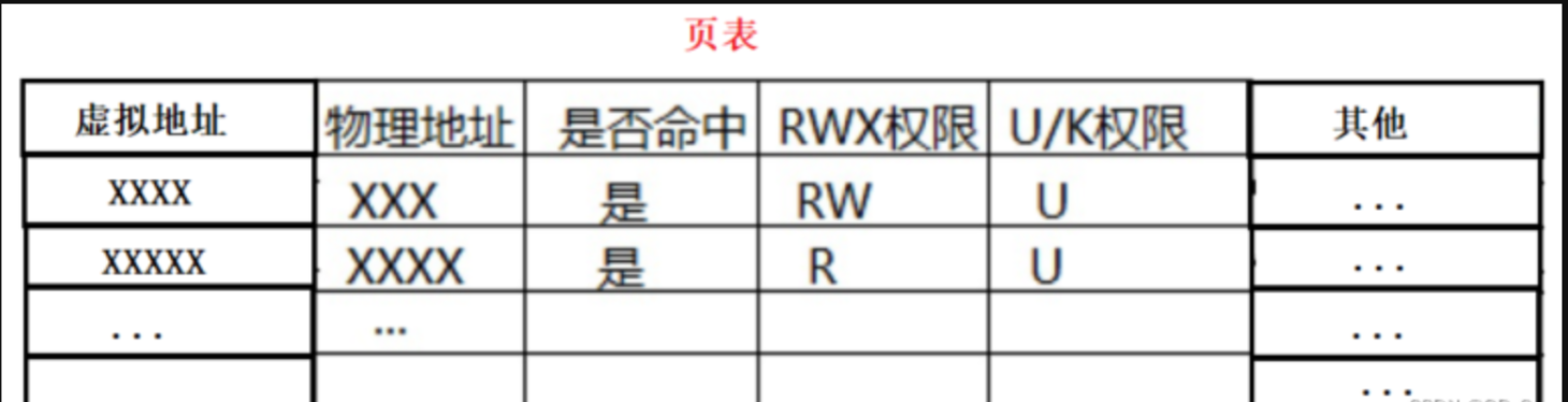 如上图所示的页表示意图,页表中不仅有虚拟地址和物理地址的映射关系,还有是否命中,RWX权限,U/K权限等等内容。