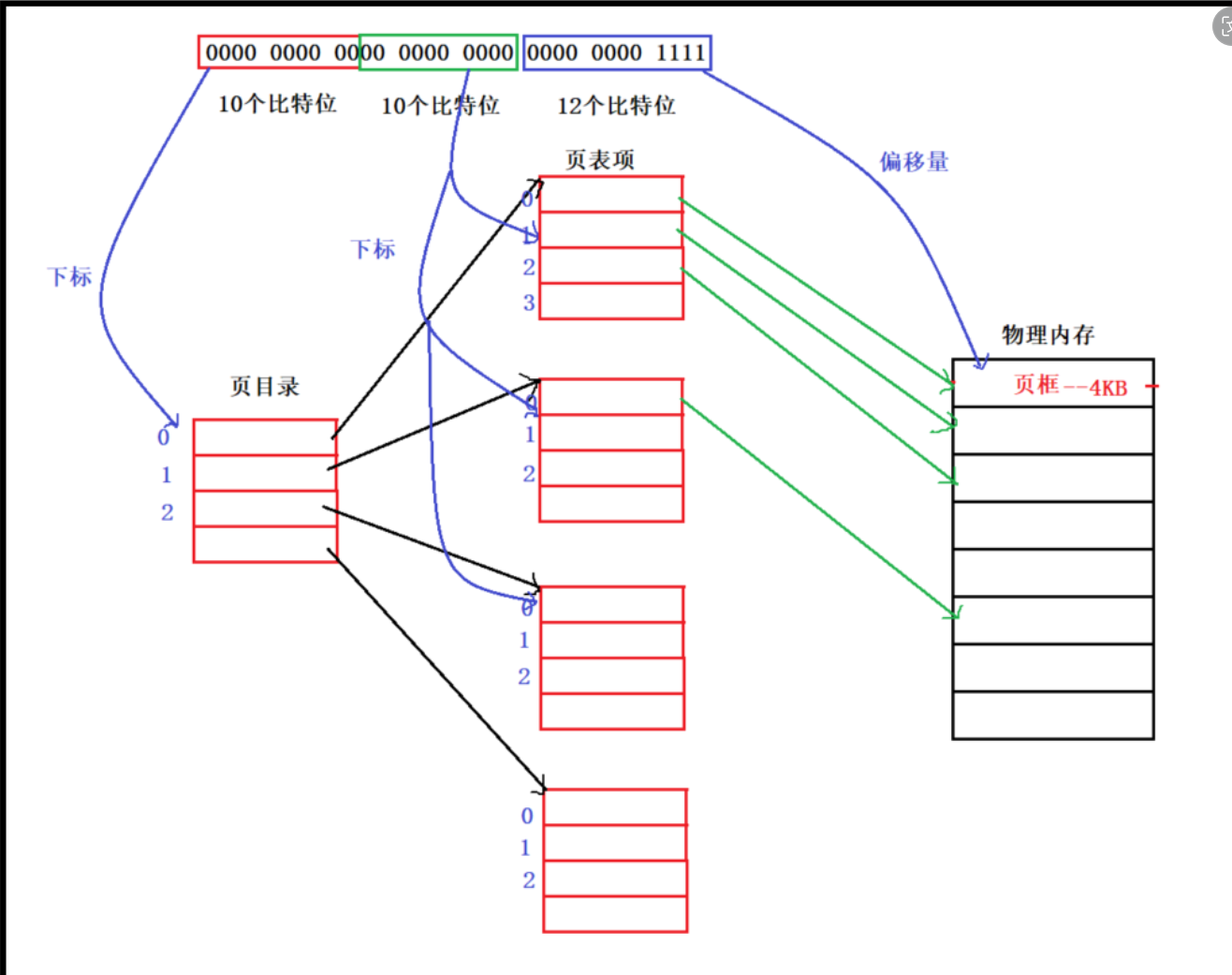 - 32个比特位中的低12位,作为偏移量,在物理内存中页框的起始地址基础上进行偏移,此时就可以得到具体数据在内存中的地址。