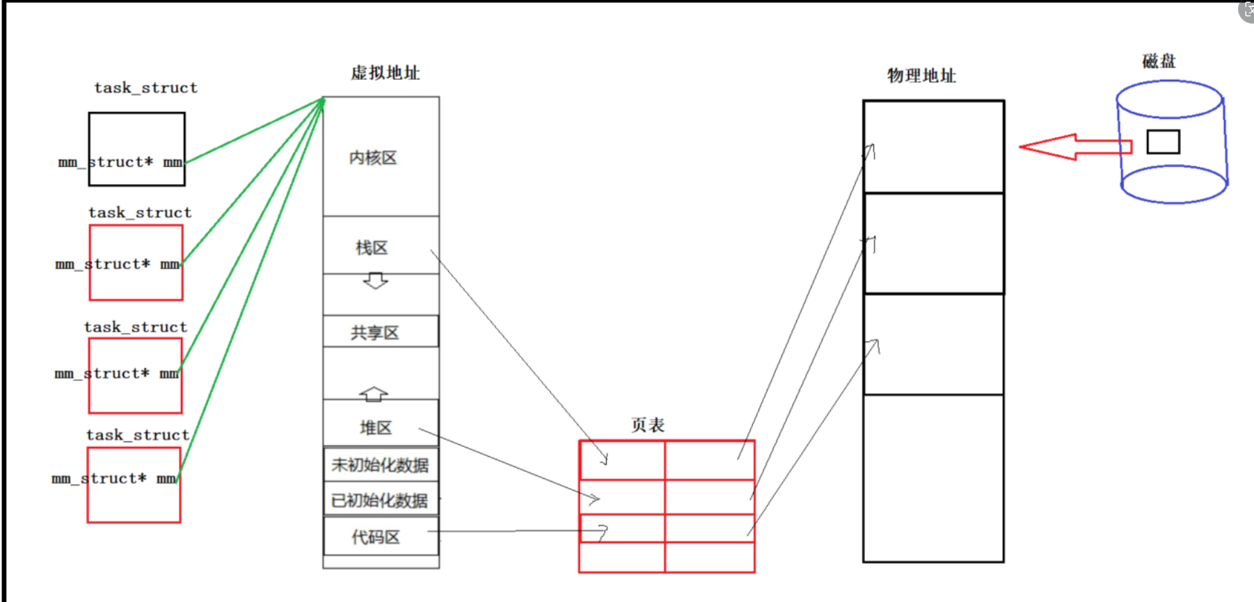 新创建的"子进程"中的mm_struct* mm都指向父进程的虚拟地址空间。也就是说,所有"子进程"和父进程共用一块虚拟地址空间。