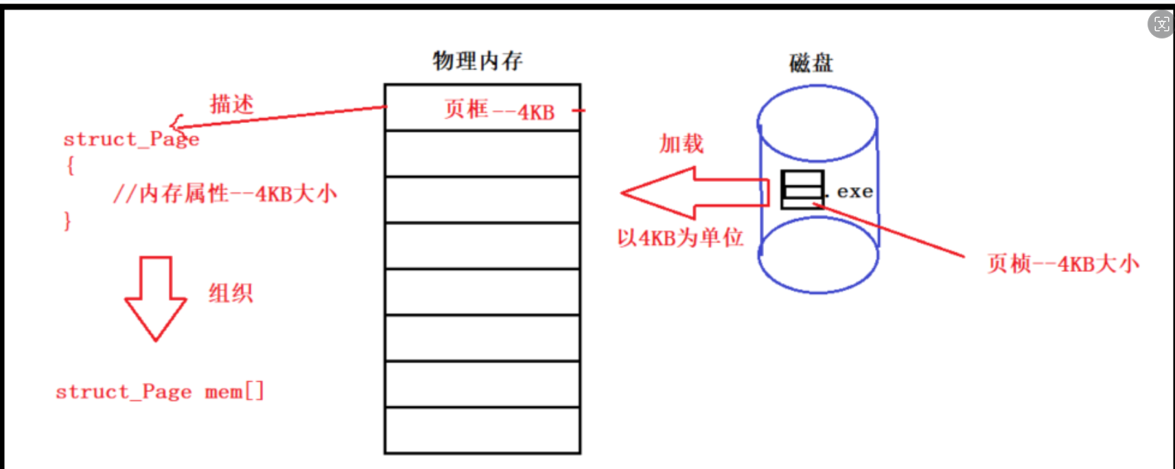 这一切都是设计好的,所以可执行程序在加载到内存中的时候是以4KB为单位的,正好一个页帧来填充一个页框。当页框被填充了以后,就会创建对应的struct_Page结构体对象,并且放在数组中,让操作系统来管理。