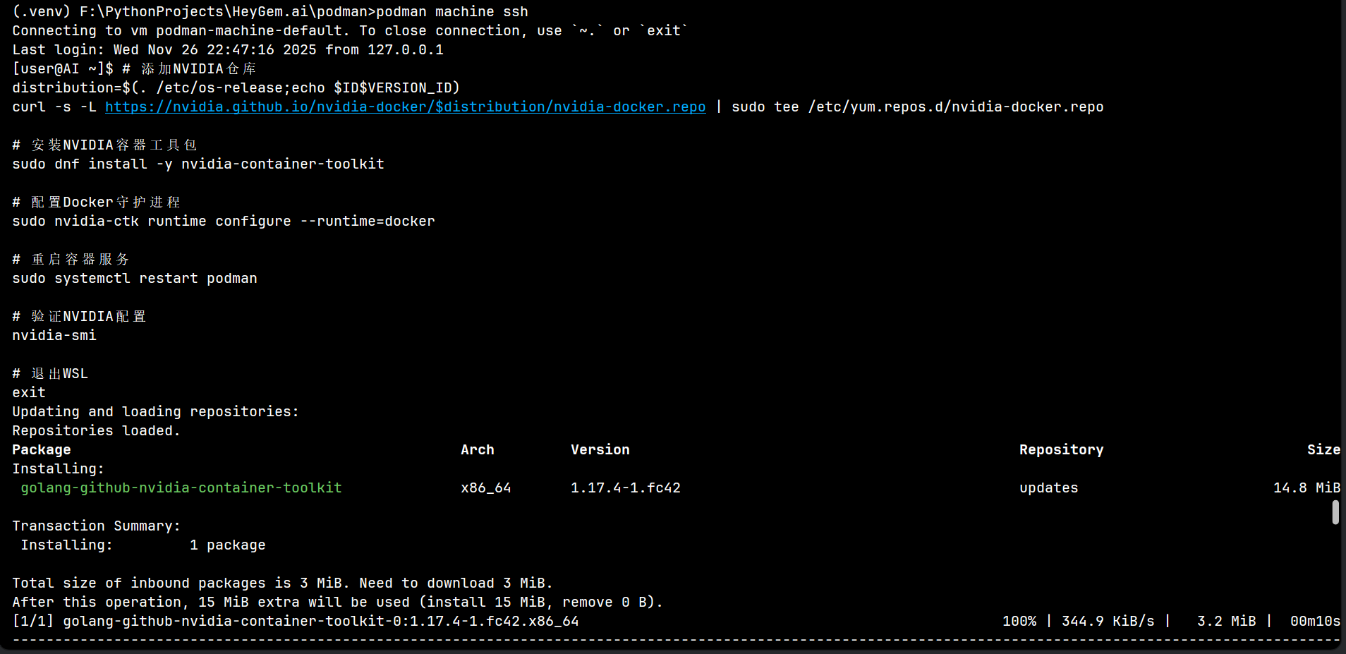 【笔记】在 Podman Machine(Fedora 42)中安装 NVIDIA Container Toolkit 使镜像能使用GPU