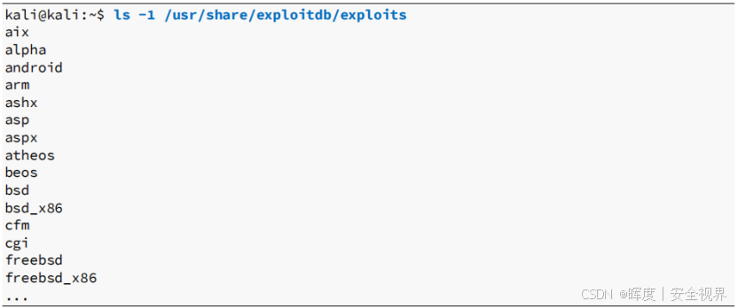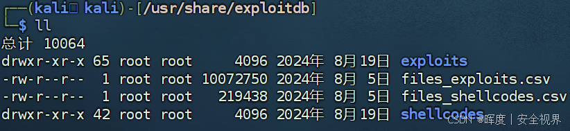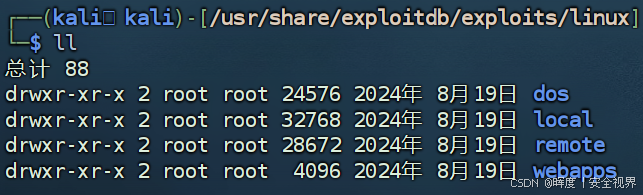 执行更新后,所有漏洞数据将存储在 /usr/share/exploitdb/ 目录下,其结构清晰,便于浏览: