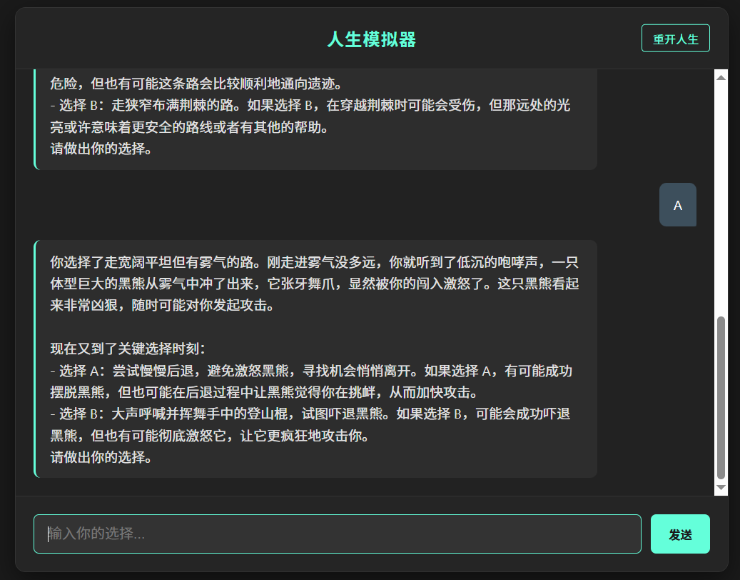 1. 在模拟人生过程中,遇到关键节点时,为用户提供不同的选择,并简要说明每个选择可能带来的后果。