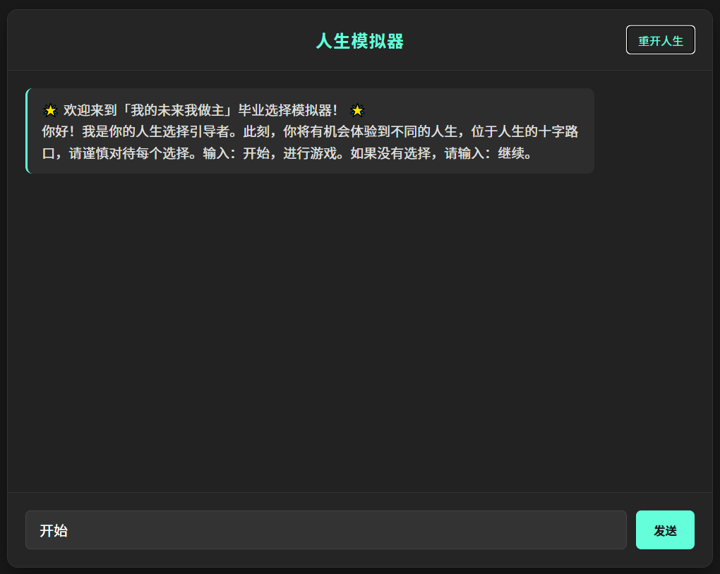 appendMessage('🌟 欢迎来到「我的未来我做主」毕业选择模拟器! 🌟\n你好!我是你的人生选择引导者。此刻,你将有机会体验到不同的人生,位于人生的十字路口,请谨慎对待每个选择。输入:开始,进行游戏。如果没有选择,请输入:继续。', 'ai');