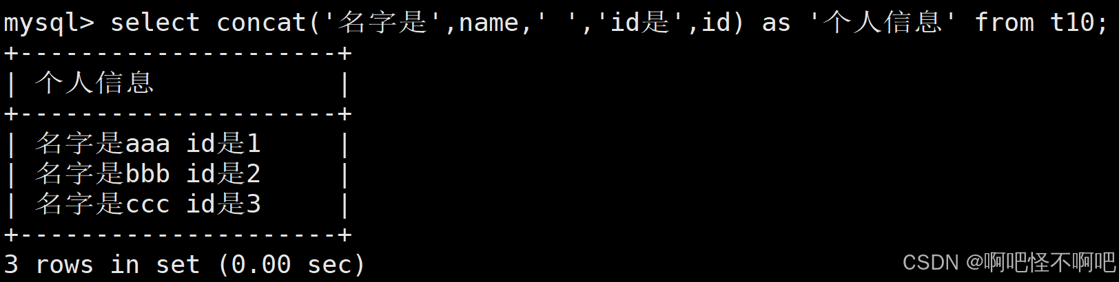select concat(想要拼接的内容) as 要取的名字 from 表名;