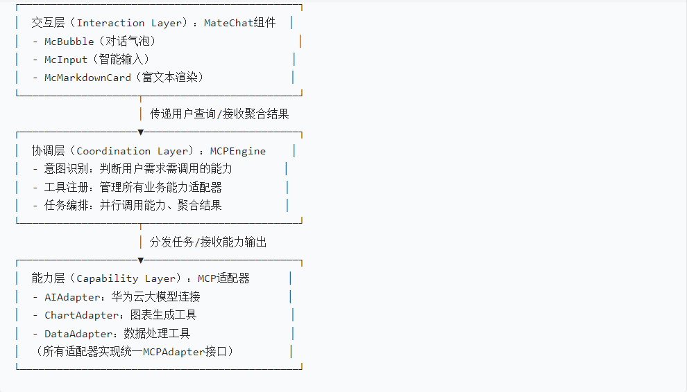 交互层(Interaction Layer) :基于华为MateChat组件 实现对话界面,包括McBubble气泡消息、McInput智能输入框、McMarkdownCard富文本渲染。这一层只负责展示,不关心业务逻辑。