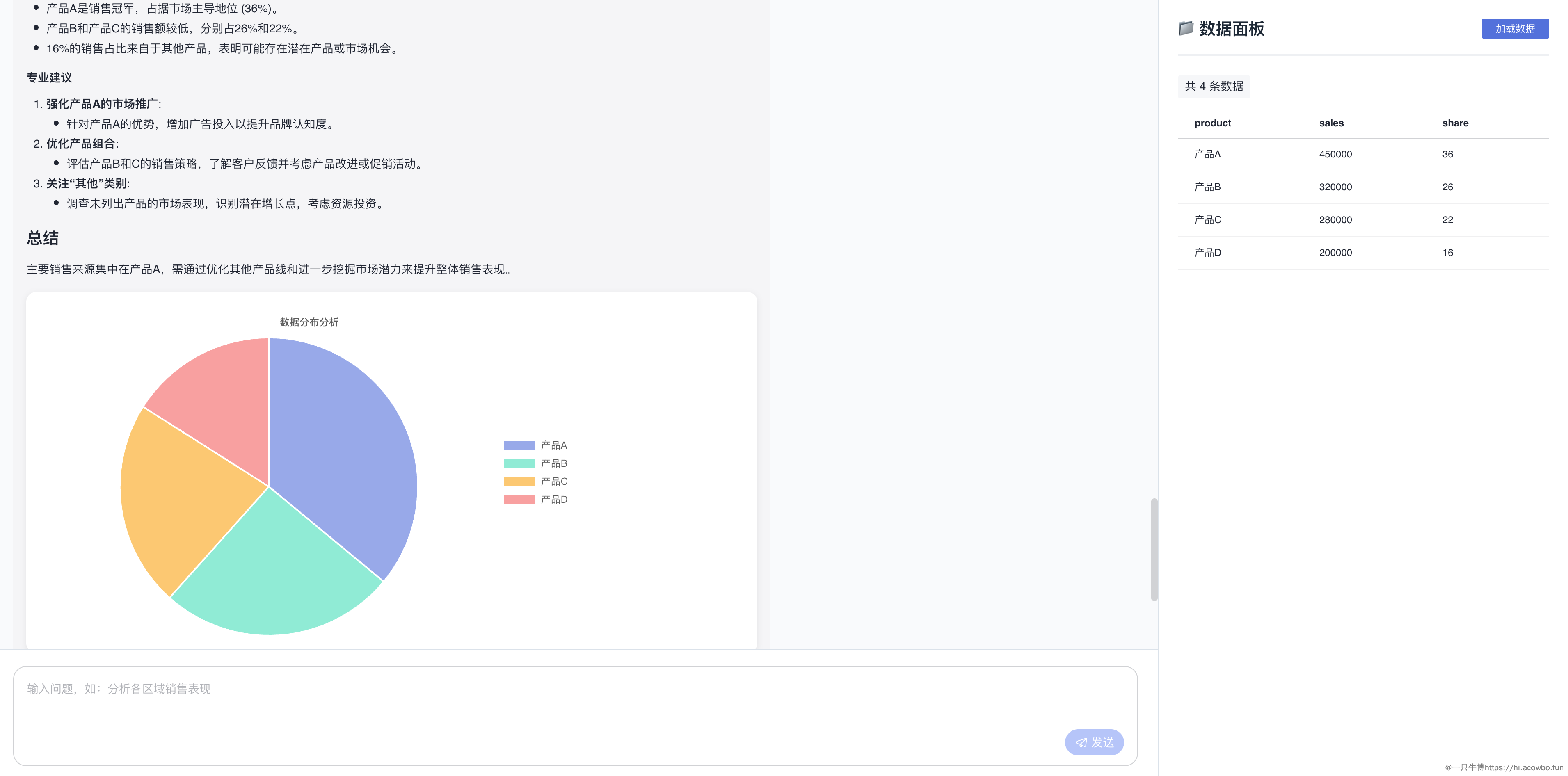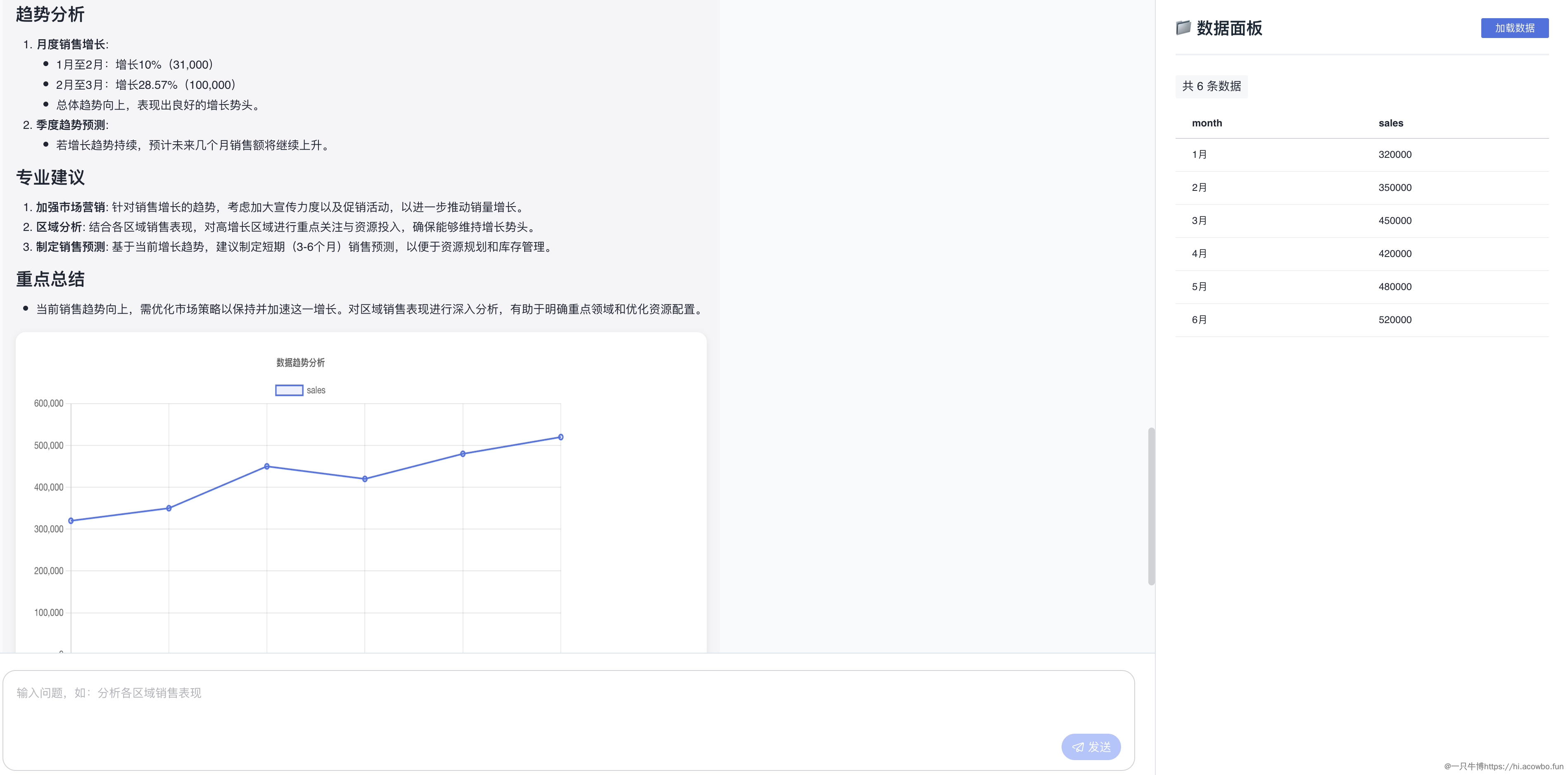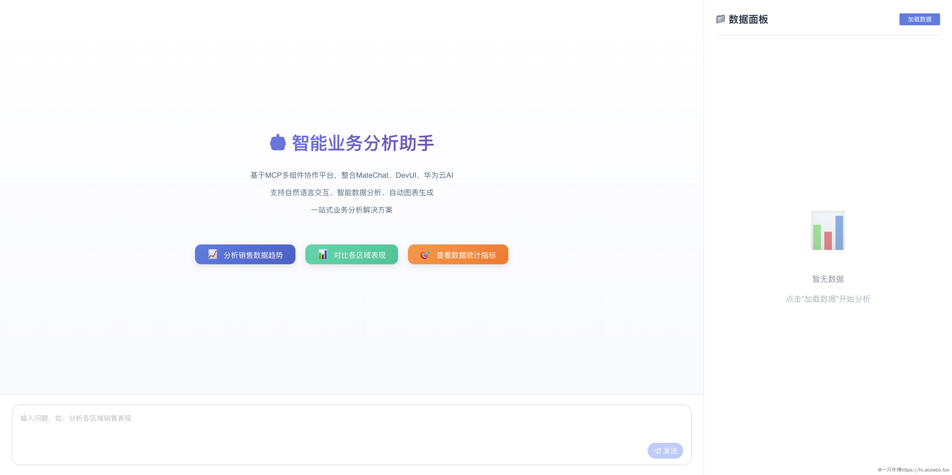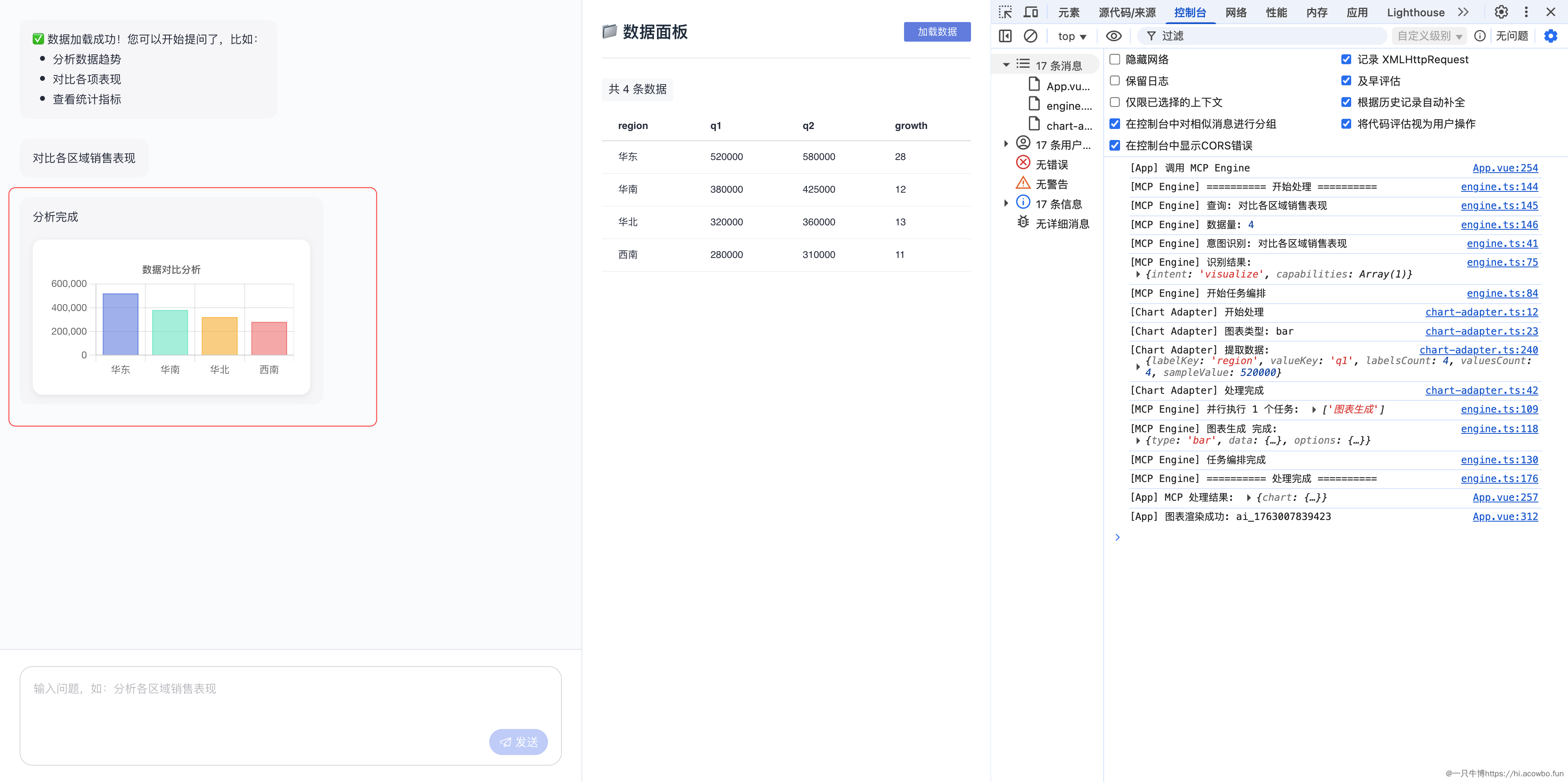 这个项目探索了MCP(Multi-Component Platform)多组件协作架构,将DevUI生态中的三大能力有机整合,实现了"一句话提问 → AI分析 → 自动生成图表 → 展示关键指标"的完整闭环。实测中,从输入"对比各区域销售表现"到展示完整分析结果(包含AI解读、可视化图表、数据指标)仅需2.5秒,且AI回复支持流式输出,用户体验接近真人对话。