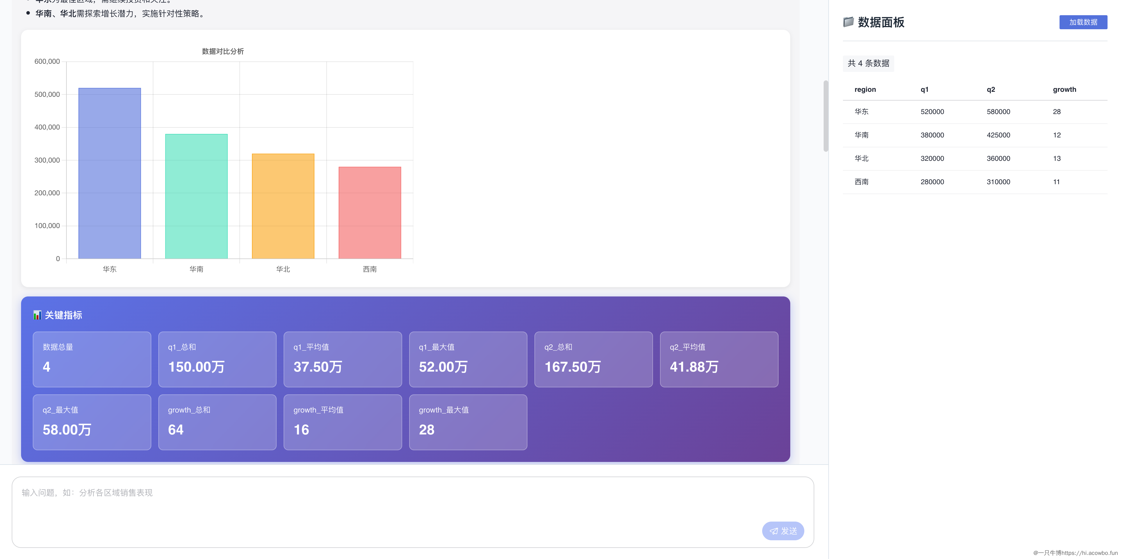 左侧对话区域展示了AI的分析结论:"华东区域表现最佳,Q1销售额52万,增长率28%。华南、华北需探索增长潜力。"