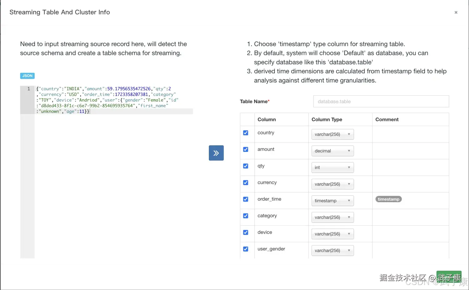 | ✅ | TimedJsonStreamParser 解析三段式 JSON(dimensions/metrics/timestamp)按示例可用;嵌套字段建议采集端扁平化或自定义解析器。 |
