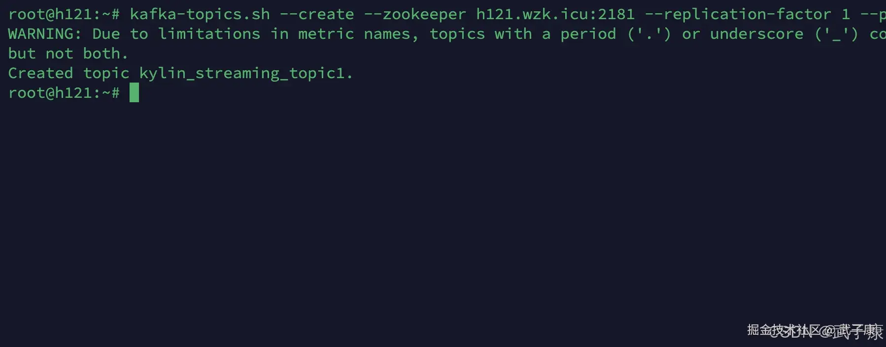 kafka-topics.sh --create --zookeeper h121.wzk.icu:2181 --replication-factor 1 --partitions 1 --topic kylin_streaming_topic1