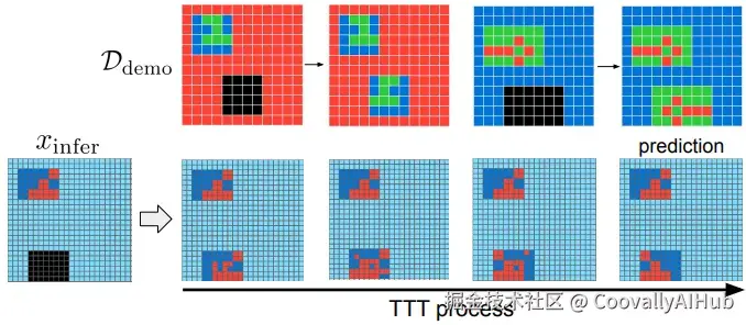 测试时训练:当遇到一个全新的测试任务时,VARC会利用该任务提供的少数几个演示样例,对模型进行快速微调。这个过程相当于让模型"临阵磨枪",快速适应新任务的特定规则,是实现小样本泛化的关键。下图展示了测试时训练的效果: