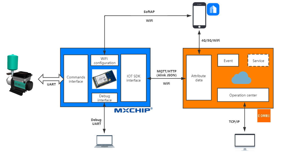 [水泵MCU] <---> [WiFi模组] <---(MQTT over WiFi)---> [阿里云物联网平台] <---(非MQTT)---> [手机App]