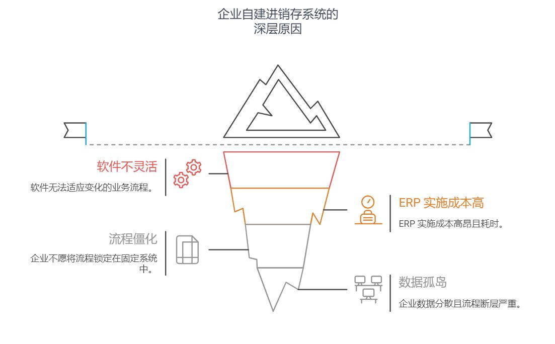 但绝大多数传统进销存系统是"固定结构",流程变一点就得找厂商二开,或者根本改不了。