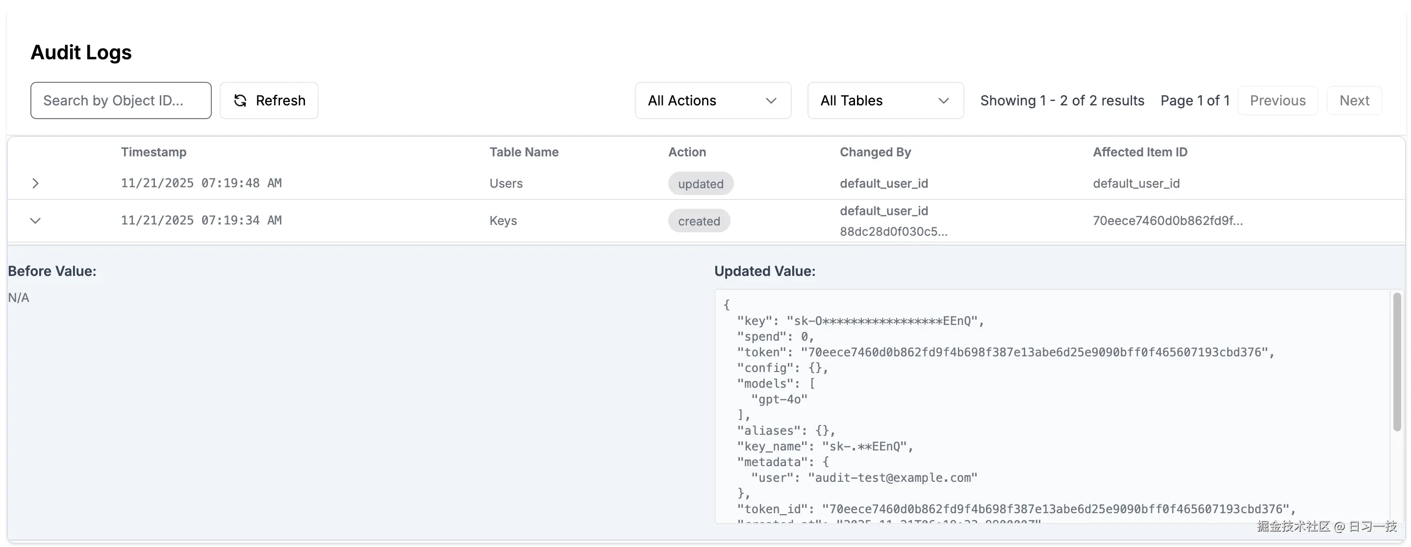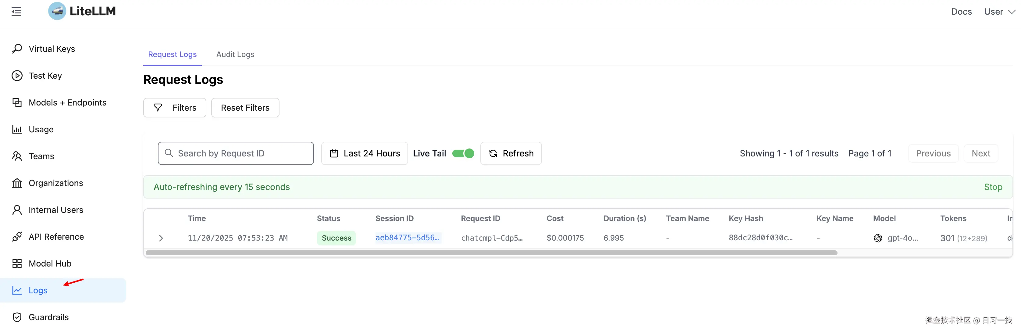 - 请求日志(Spend Logs) 精确记录每一次 API 调用的详细信息,可以通过