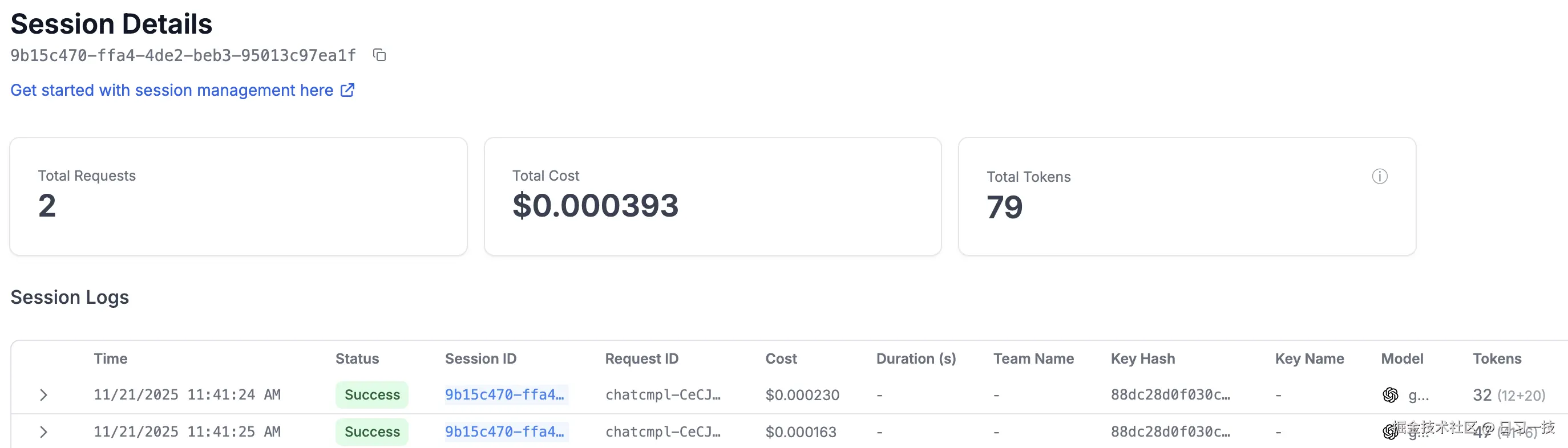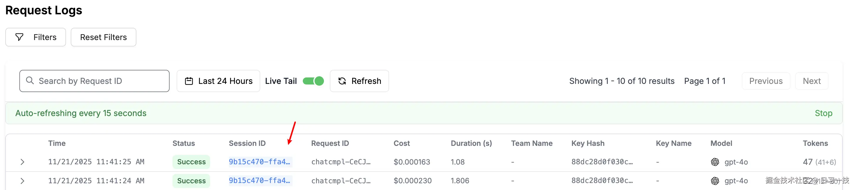 在 LiteLLM 的 UI 中,可以看到生成的两条请求日志 Session ID 是相同的: