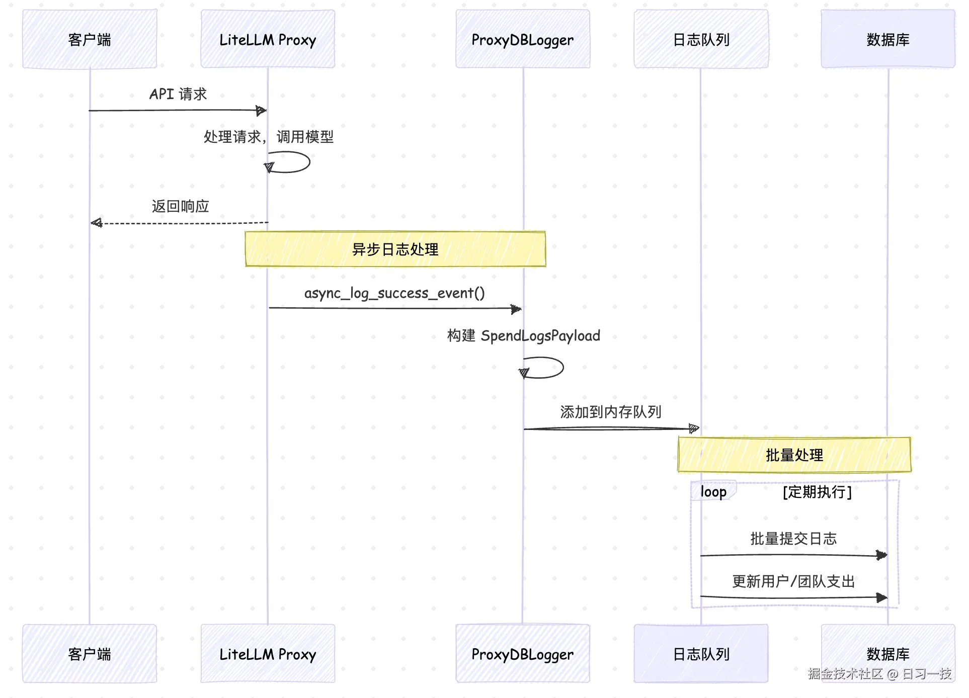 LiteLLM 的请求日志保存在 Postgre 数据库的 LiteLLM_SpendLogs 表中,在高并发场景下,如果每一笔请求都同步写入数据库,会对性能造成巨大影响。为了最小化对主要请求路径的性能影响,它采用了 异步队列和批量处理 的优化手段: