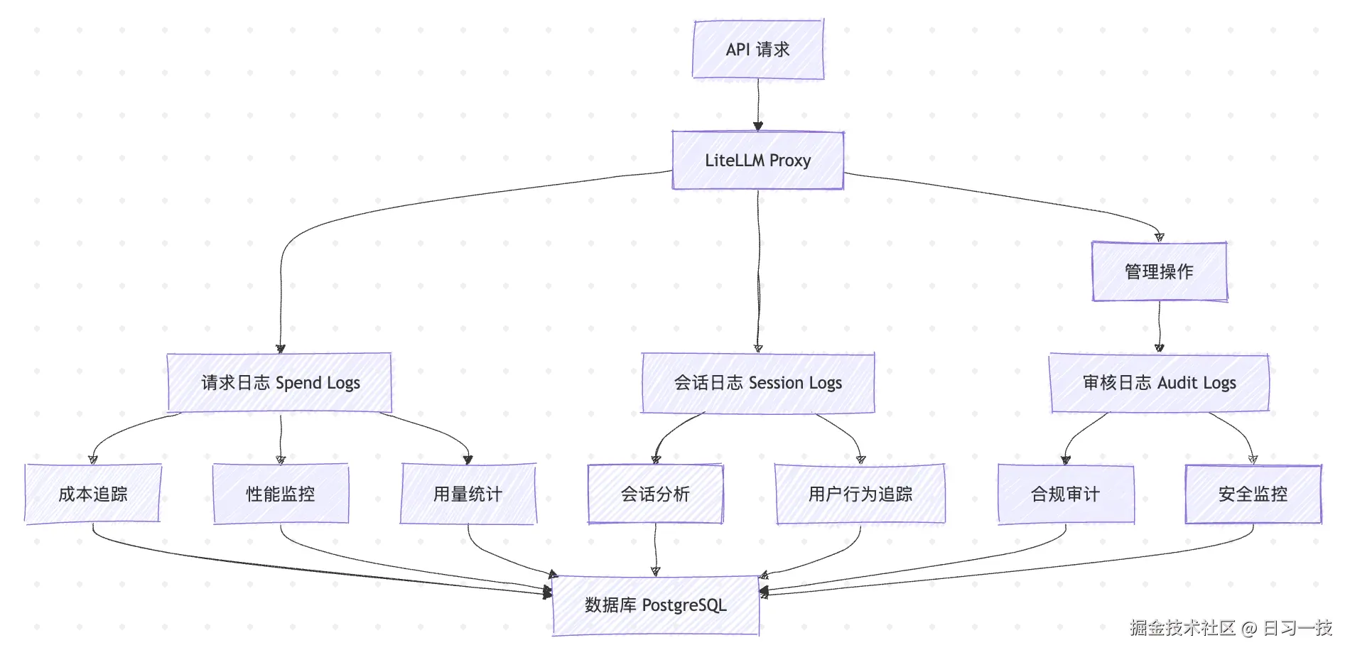 我们今天就来学习下 LiteLLM 的日志体系,主要包括 请求日志(Spend Logs) 、会话日志(Session Logs) 和 审核日志(Audit Logs):