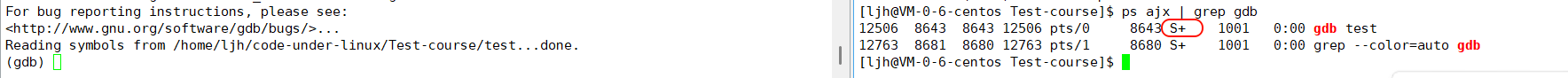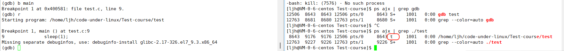 b main打主函数断点、r运行程序后,程序会在断点处暂停 ------ 此时被调试的./test 进程进入 t 态(跟踪停止状态),gdb 进程仍保持 S 态(等待后续调试操作)。这里的