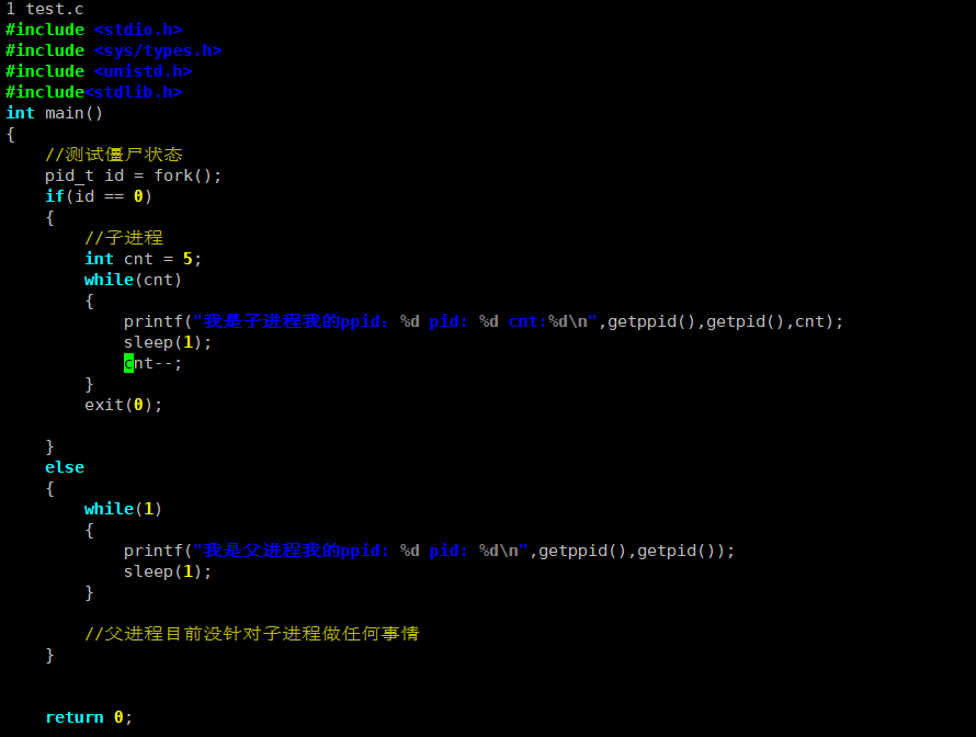 - 僵死状态(Zombies)是一个比较特殊的状态。当进程退出并且父进程(使用wait()系统调用,后面讲) 没有读取到子进程退出的返回代码时就会产生僵尸进程