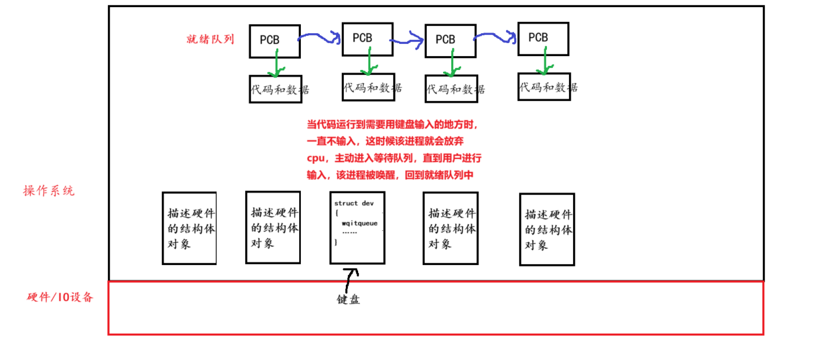 - 状态特征:处于阻塞态的进程,即使 CPU 空闲也无法被调度执行(因为缺少必要资源),其 PCB 会被移至 "阻塞队列"(而非就绪队列);