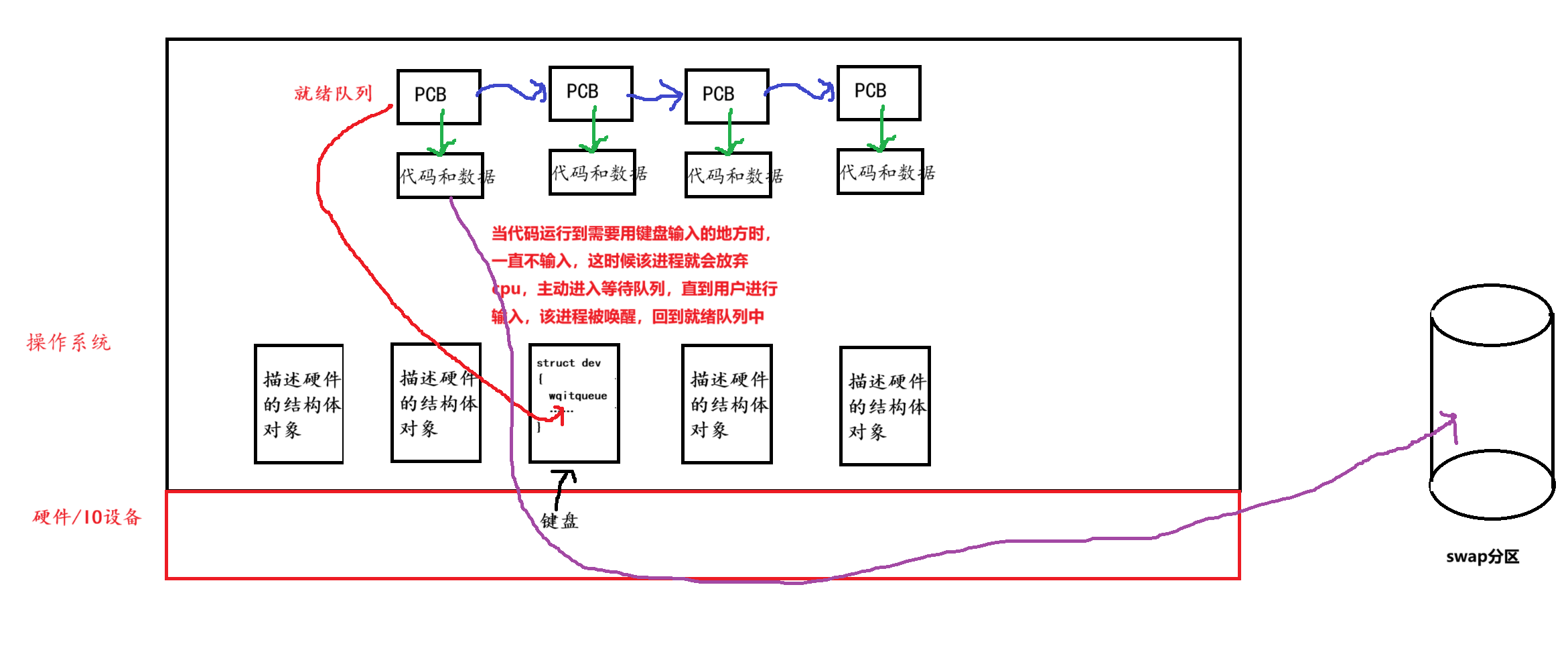 - 就绪 ↔ 挂起就绪:内存不足时,就绪进程(代码和数据被换出,PCD对象还在内存中)被 "换出" 到外存;外存中进程被 "换入" 回内存