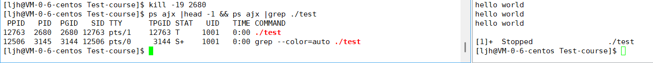 kill -19(对应SIGSTOP信号)暂停了进程,此时进程进入T 态(停止状态)。