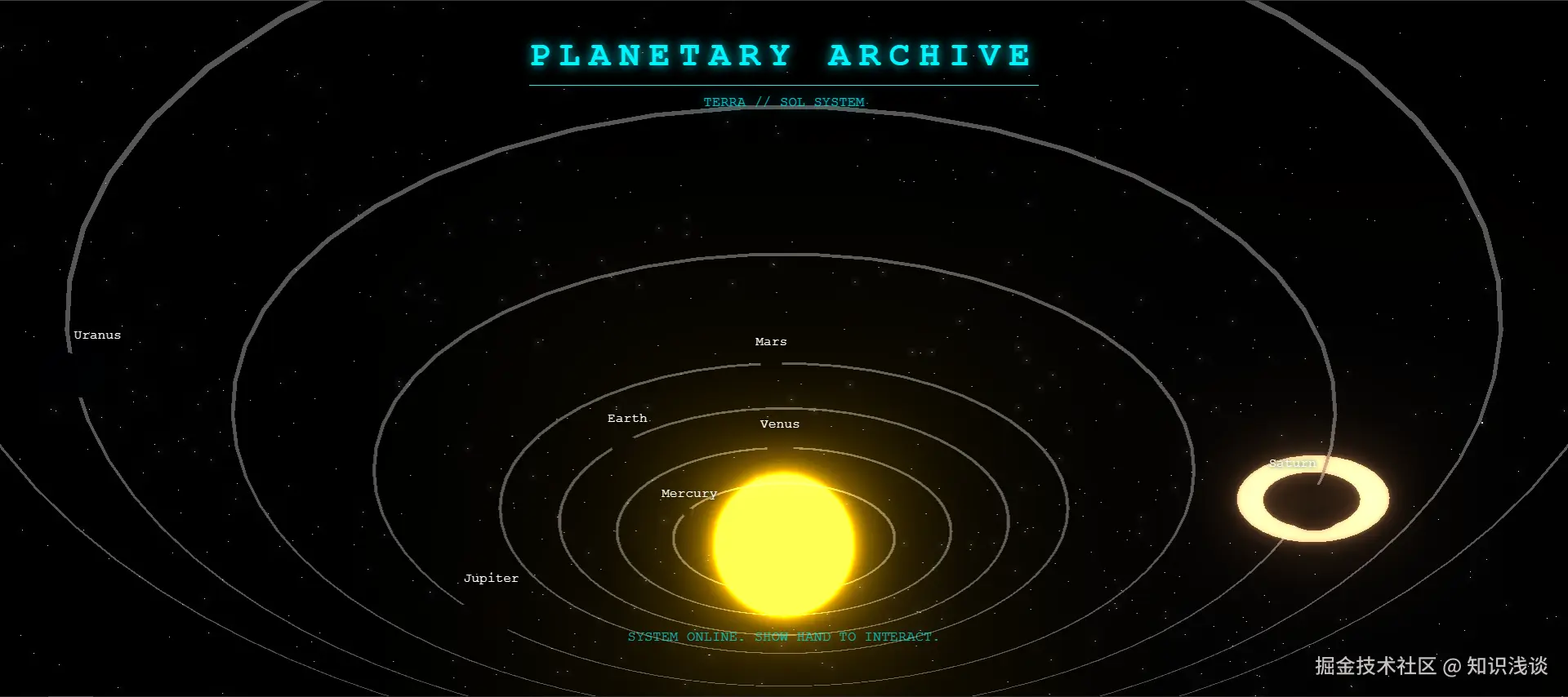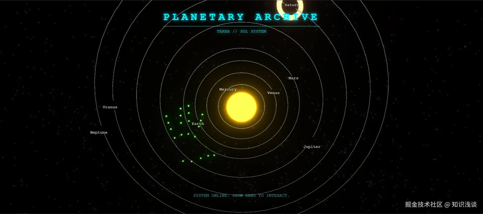 今天,我要向大家介绍我的最新项目------Holographic Solar System 。这是一个结合了 Three.js 强大的 3D 渲染能力和 MediaPipe 先进手势识别技术的互动 Web 应用。