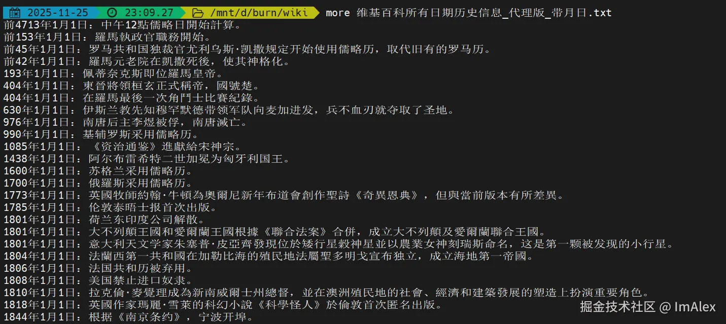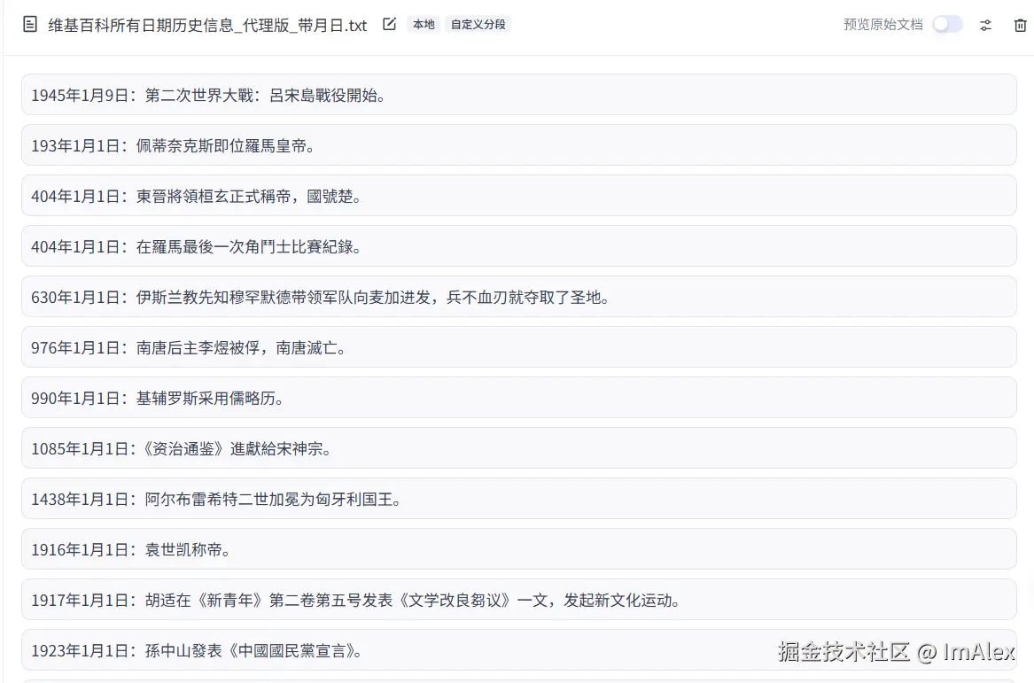 最终,通过"维基百科数据源+代理IP+Python爬虫"的组合,我成功构建了一份覆盖全年日期、包含大事记、出生、逝世三大核心维度的高质量知识库,让智能体能够精准定位历史事件,彻底解决了"回答模糊、遗漏关键信息"的问题。