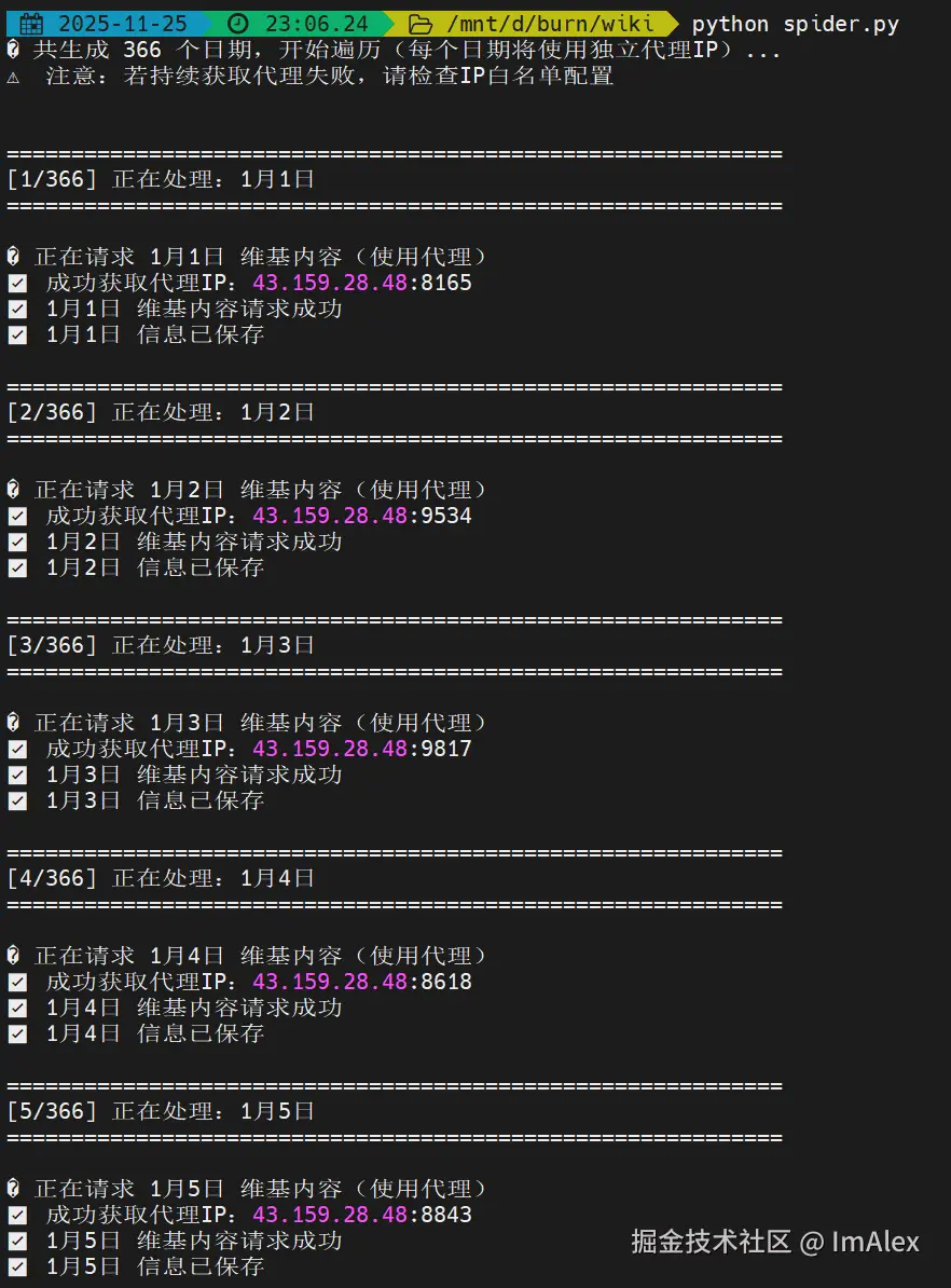 爬取每个日期的事件前,先提取一个代理IP。然后使用代理IP去抓取,抓取到内容后进行内容清洗,保存到文件:维基百科所有日期历史信息_代理版_带月日.txt中,依次循环,直到抓取完365/366个日期的所有事件。
