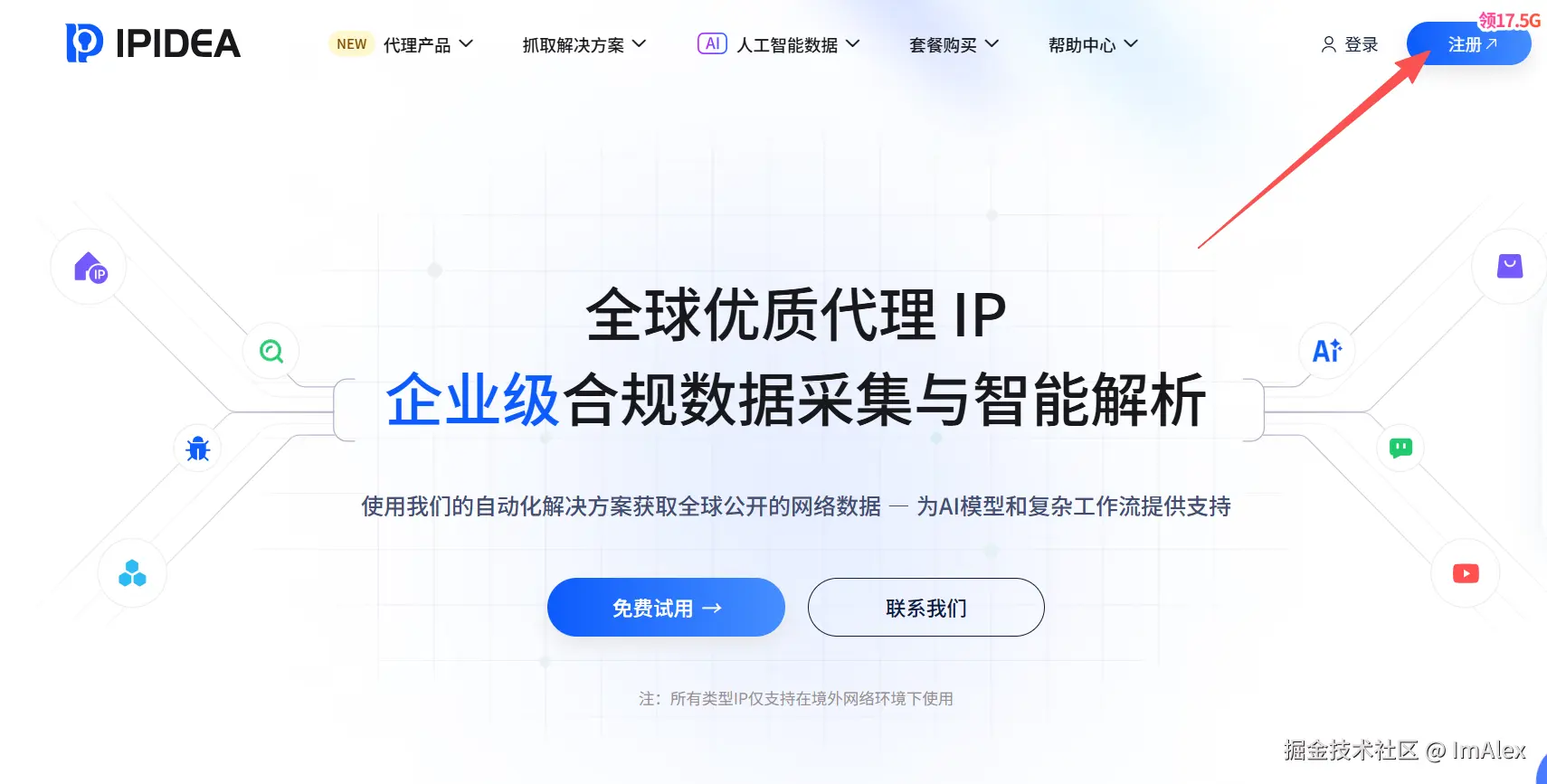 首先访问IPIDEA官网,点击右上角注册按钮,完成注册登录。