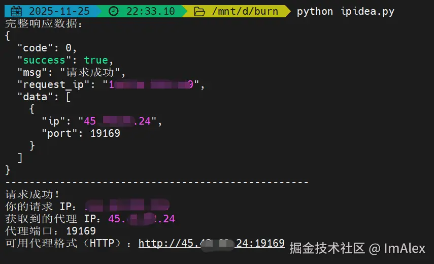 接下来,我们写一段python代码,来验证API的有效性,确保我们能够顺利提取到代理IP,同时验证我们的白名单IP配置是否生效: