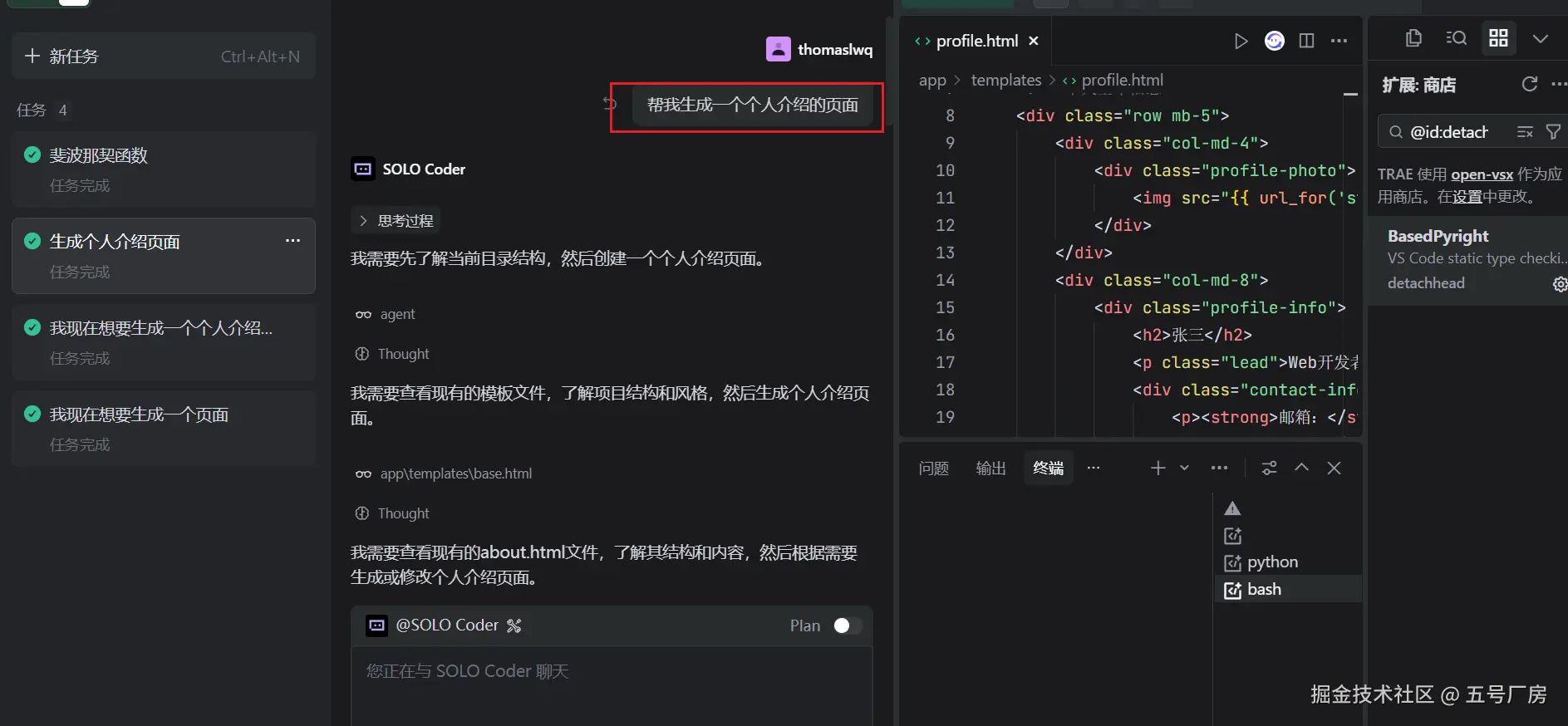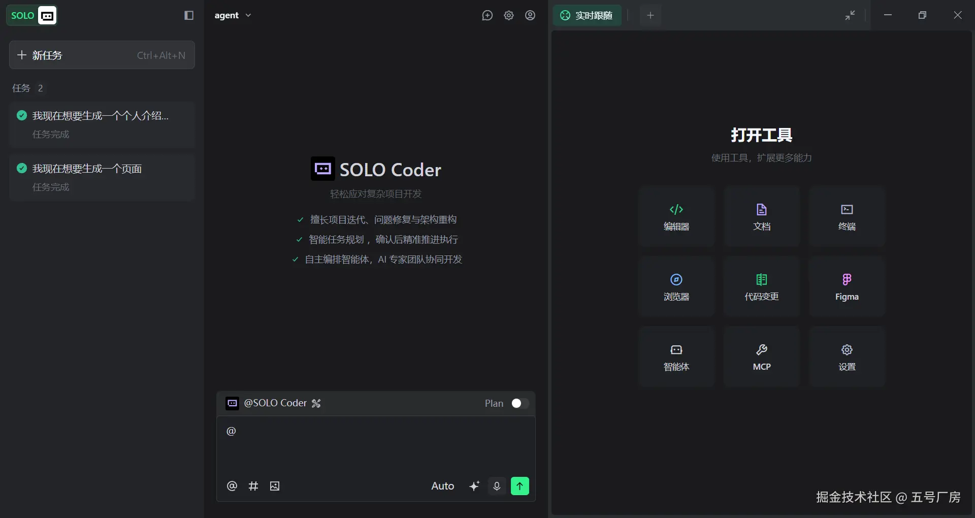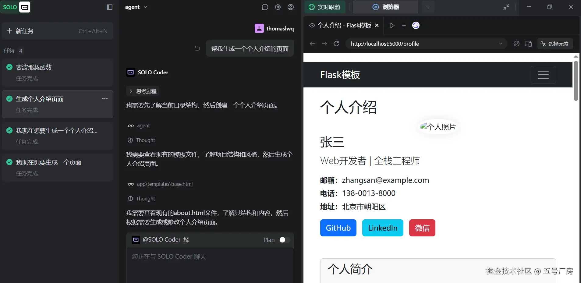 SOLO 的新版界面和之前有挺多不一样的地方,左边是一个多任务的列表,可以同时运行多个任务,中间是一个对话框,右边是一个实时预览的效果。 比如说我输入"帮我生成一个个人介绍的页面",然后SOLO Coder就开始匡匡地运行了起来。