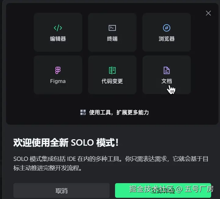 SOLO 模型集成包括IDE在内的多种工具。你只需表达需求,它就会基于目标主动推进完整开发流程