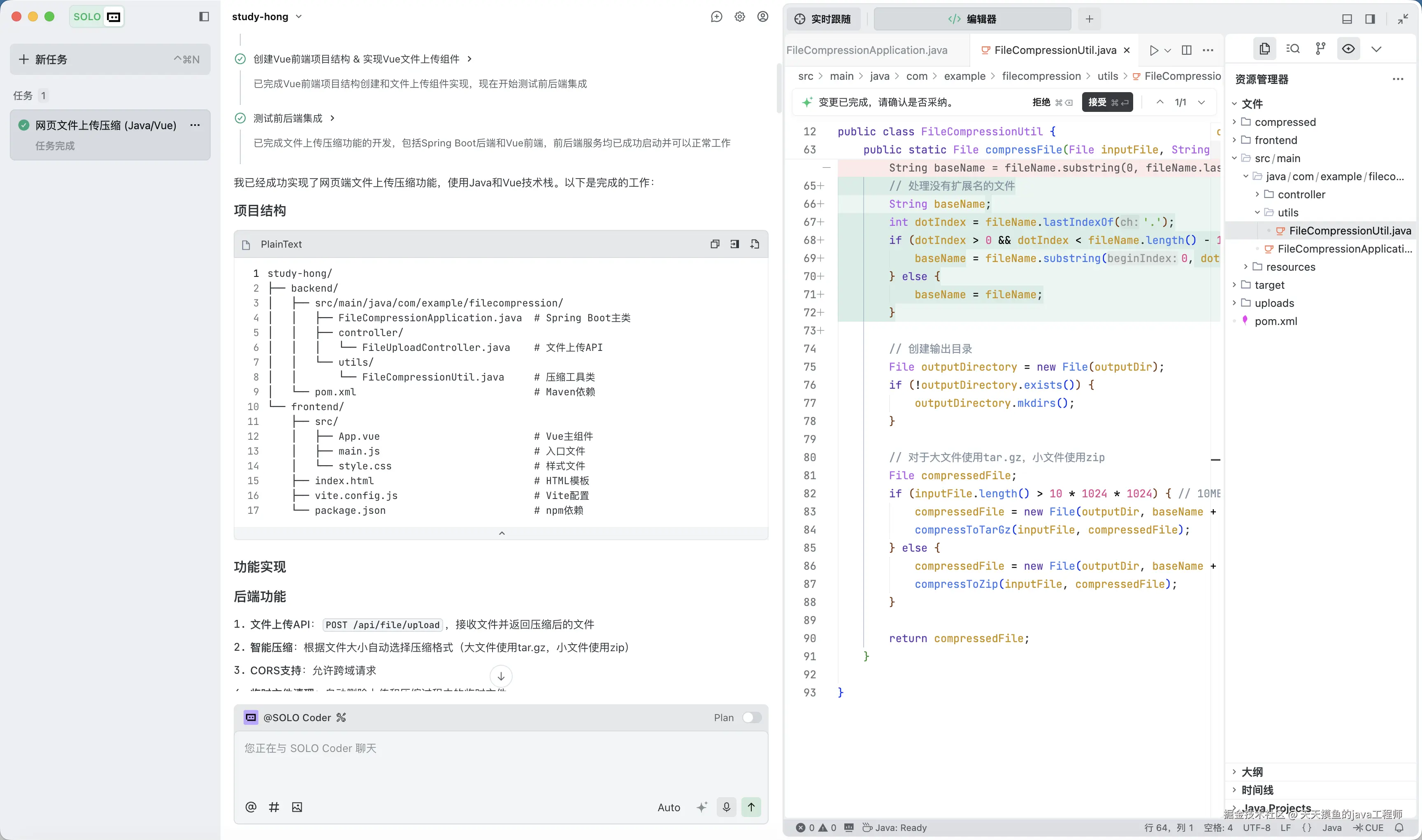 在整个开发过程中,我借助 TRAE SOLO 的任务管理 + AI协作能力,快速从无到有完成了项目结构搭建、压缩逻辑实现、前后端联调测试,并记录了每一步开发"Thought"。