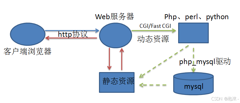 动态资源:通过指定的通讯方式将脚本网页交给后端程序执行。如果运算期间需要连接mysql数据库,则通过mysql连接器连接mysql。后端程序将运算结果返回给web服务。