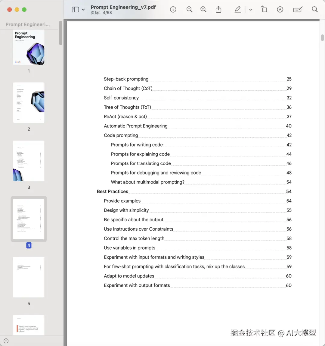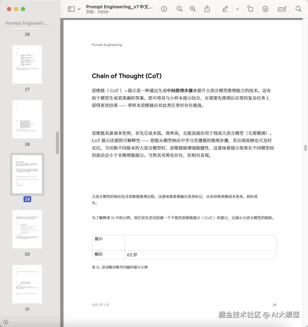 在这份白皮书中,作者详细讲解了几种核心的提示策略,包括零样本提示、小样本提示、系统提示、角色提示、上下文提示、退一步提示、链式思考(Chain of Thought)、自我一致性(Self Consistency)、思维树(Tree of Thoughts)以及ReAct方法。