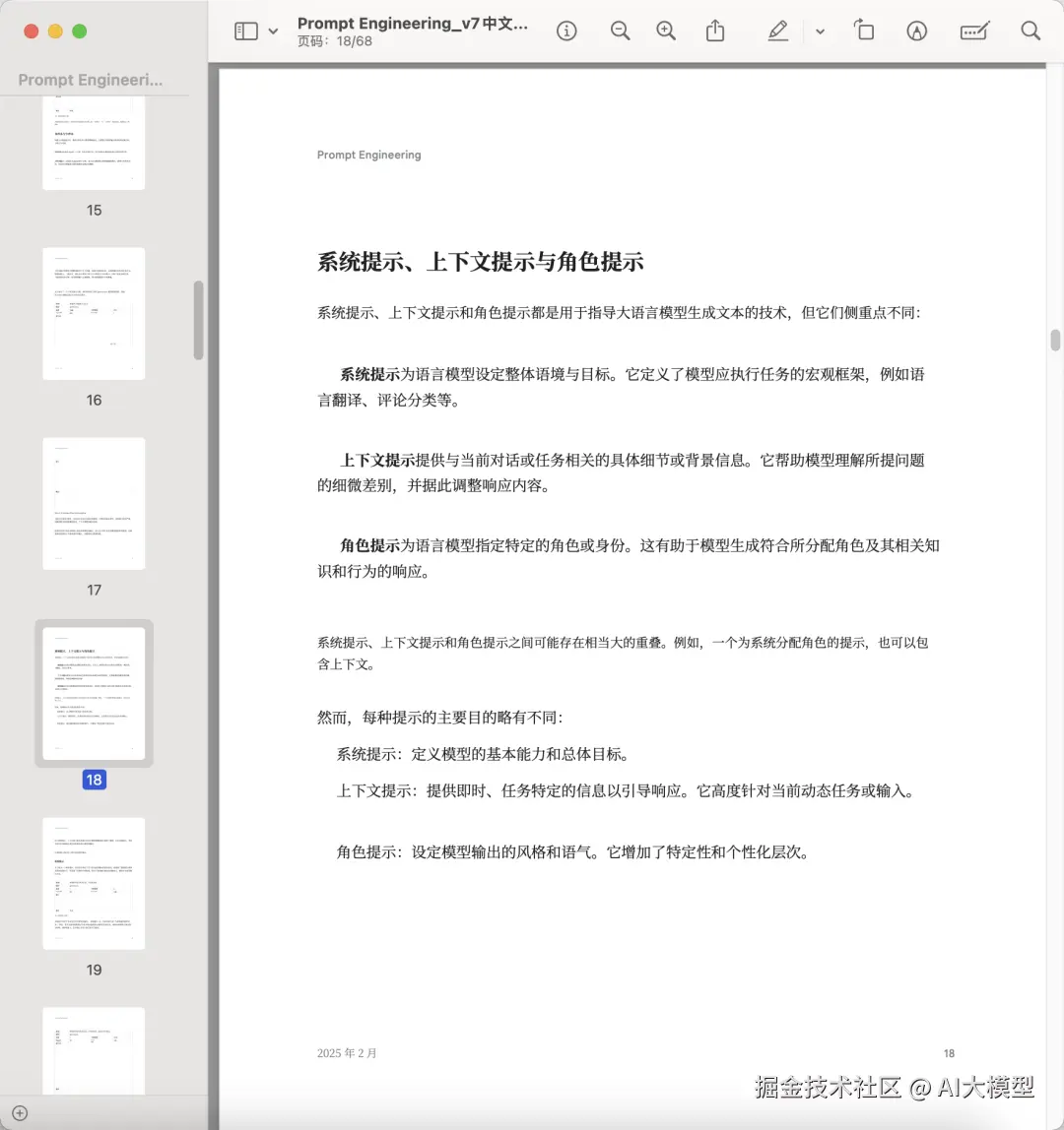 这份文档不仅全面介绍了与大型语言模型(LLMs)有效互动的方法,还深入探讨了多种高级提示技巧,旨在帮助我们更精准地利用AI技术解决实际问题。