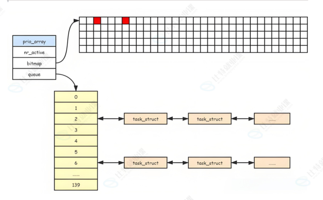• bitmap[5]:⼀共140个优先级,⼀共140个进程队列,为了提⾼查找⾮空队列的效率,就可以⽤