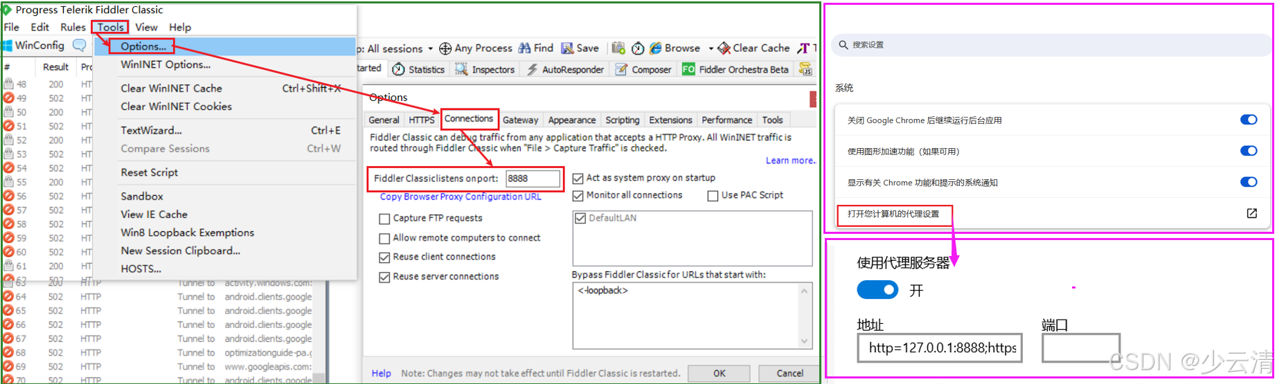 Fiddler只抓包操作,不需要任何设置。因为默认开启了代理 8888。(谷歌浏览器也不需要手工设置)