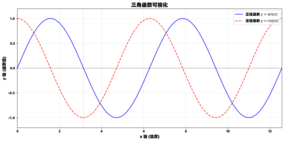 plt.title('三角函数可视化', fontsize=16, fontweight='bold')