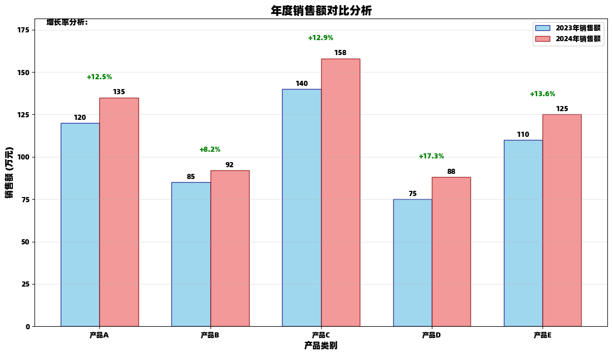 categories = ['产品A', '产品B', '产品C', '产品D', '产品E']