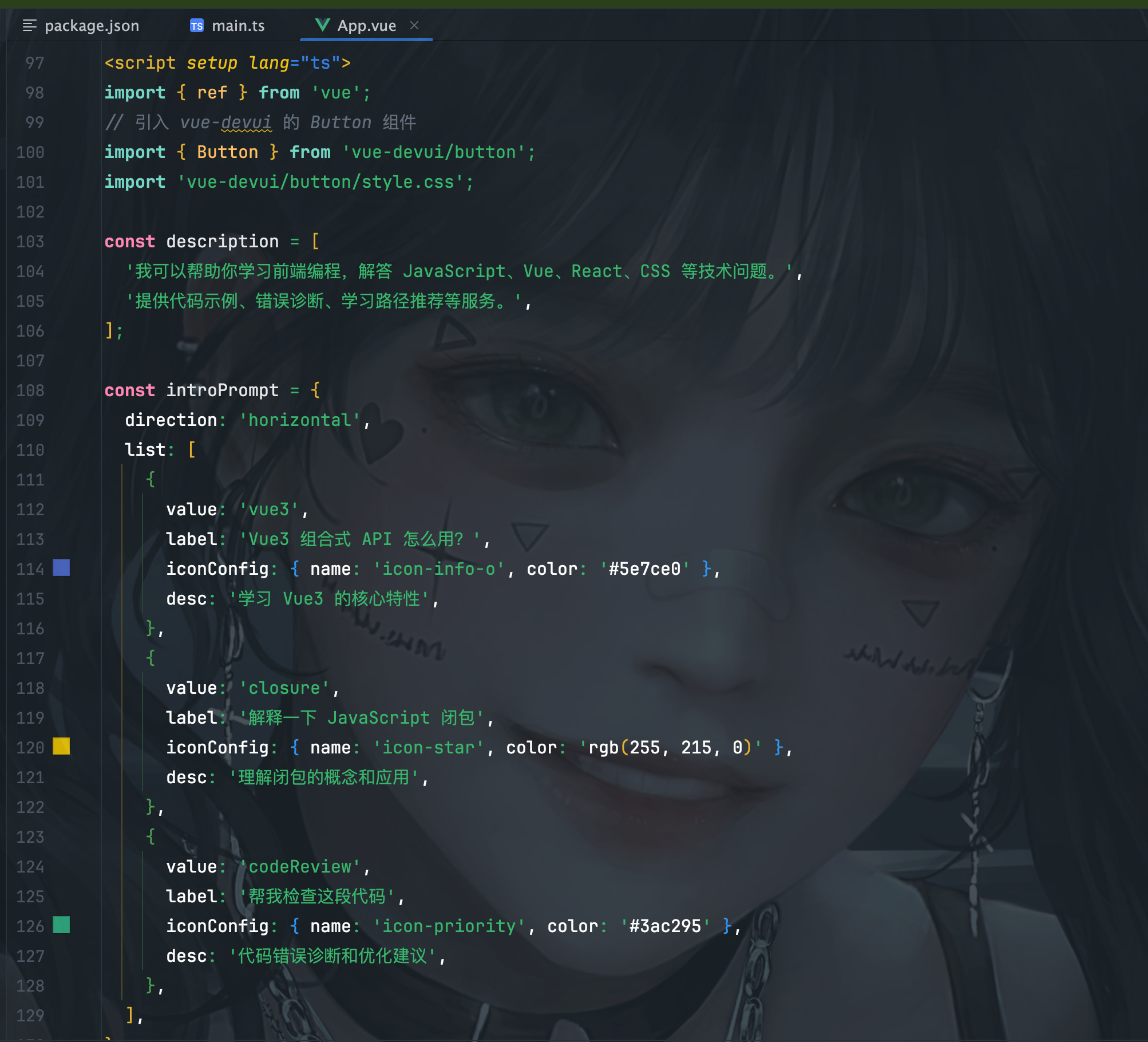 脚本部分定义了描述文字和快捷提示的配置。注意这里引入了 vue-devui 的 Button 组件,说明 MateChat 和 vue-devui 是可以无缝配合使用的。快捷提示的 iconConfig 配置了不同颜色的图标,这是视觉引导的一部分:蓝色表示基础知识,黄色表示进阶内容,绿色表示实践工具。